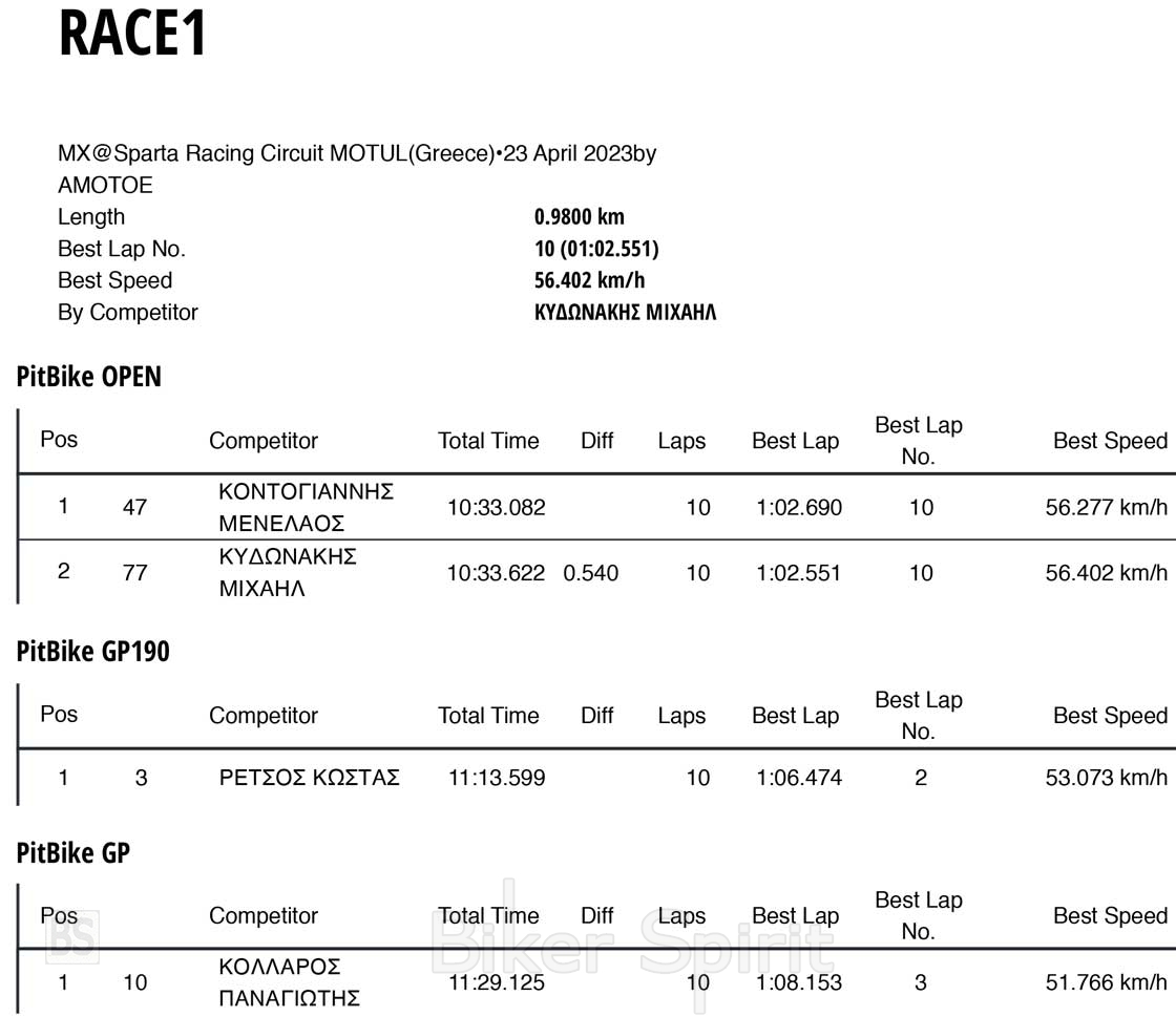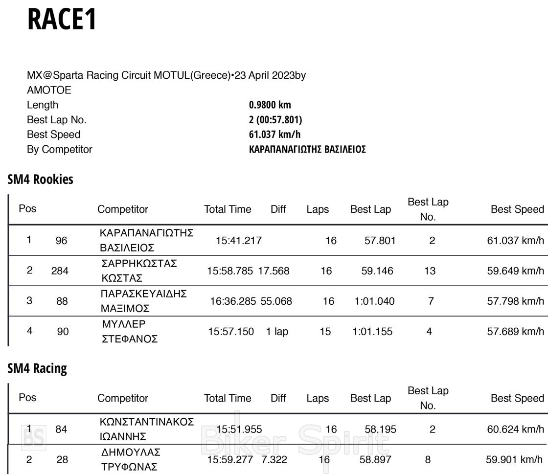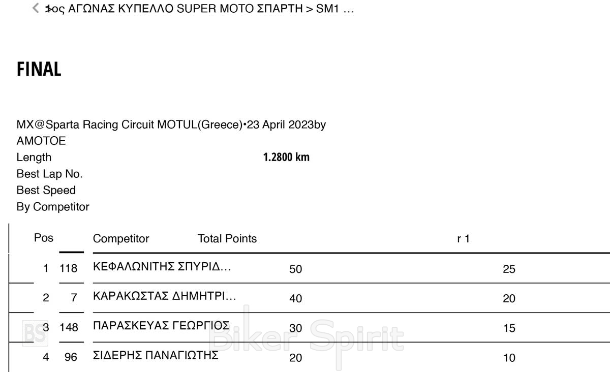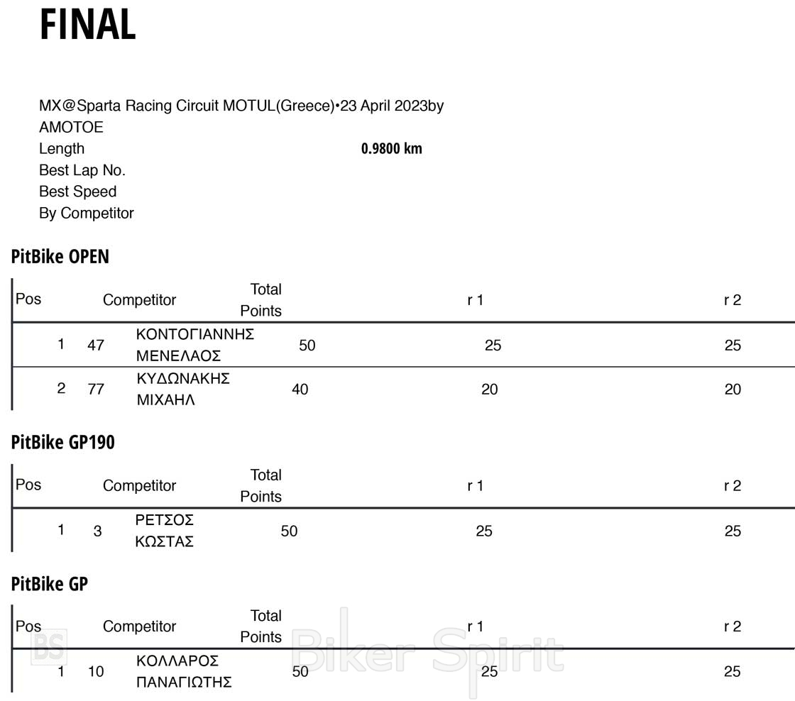 Την Κυριακή 30 Απριλίου 2023 στην πίστα Sparta Racing Circuit MOTUL έγινε ο 1ος αγώνας του Πανελληνίου Κυπέλλου Supermoto για το 2023 με 14 συμμετοχές, που διοργάνωσε το αθλητικό σωματείο Α.Μ.Ο.Σ.