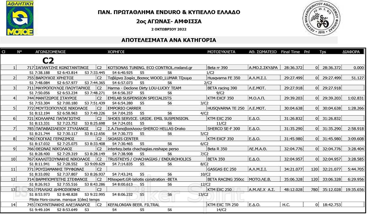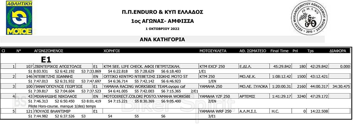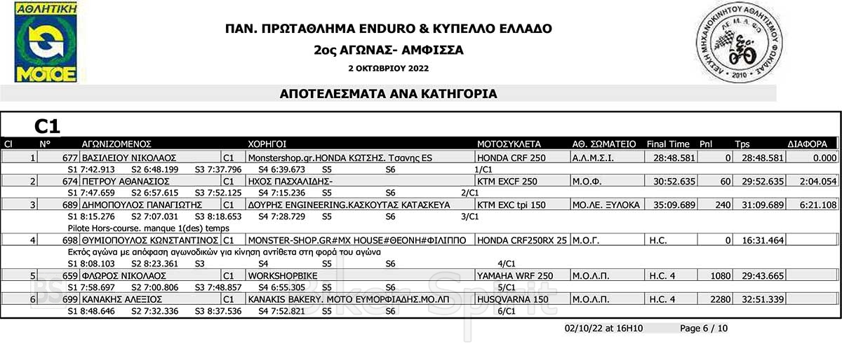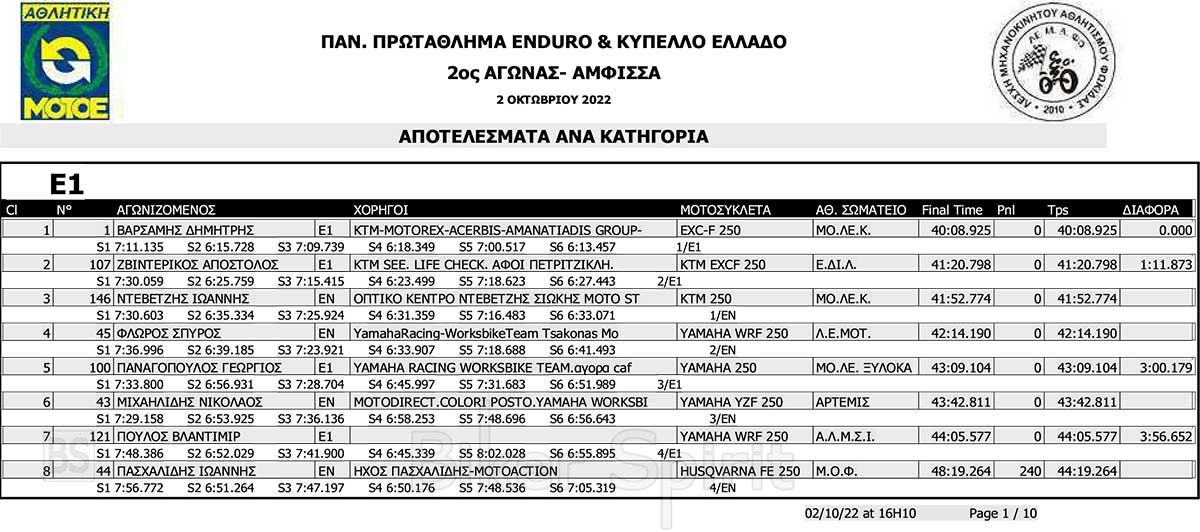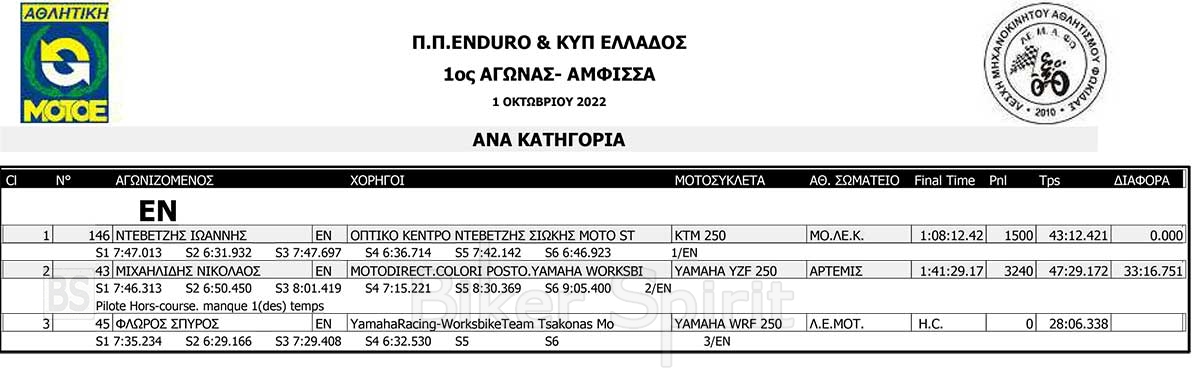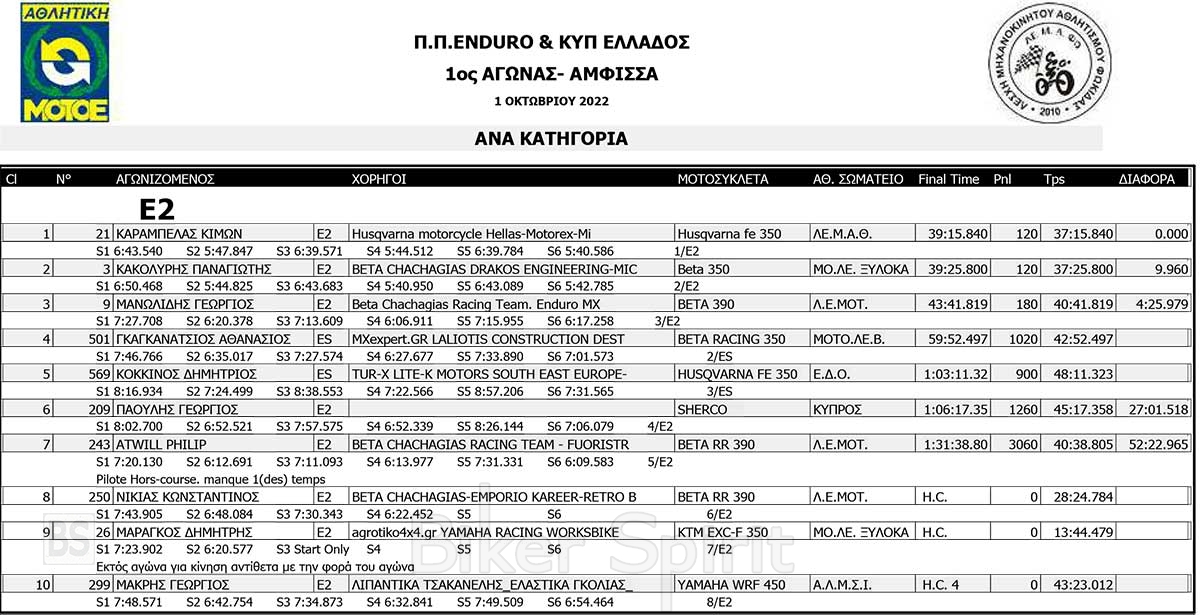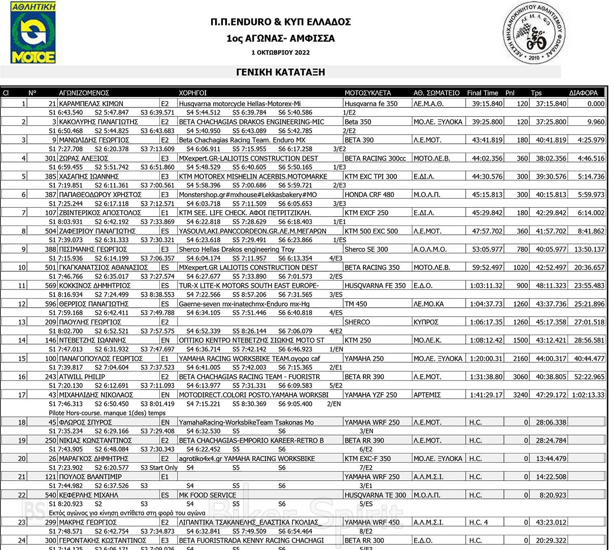 ΑΠΟΤΕΛΕΣΜΑΤΑ 1ου και 2ου αγώνα Πανελληνίου Πρωταθλήματος Enduro και 1ου αγώνα Πανελληνίου Κυπέλλου Enduro 2022 στην Άμφισσα