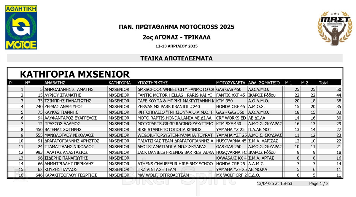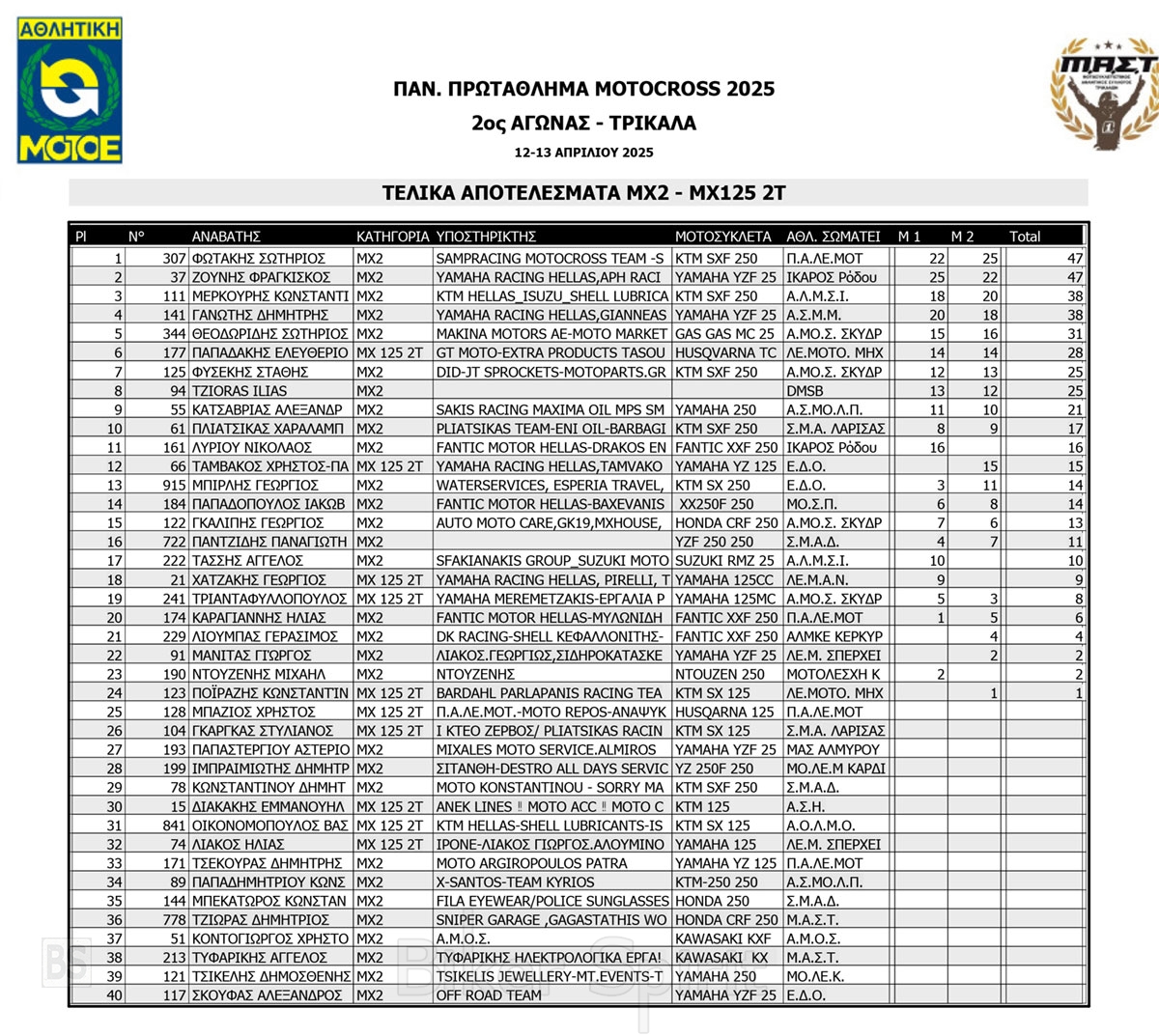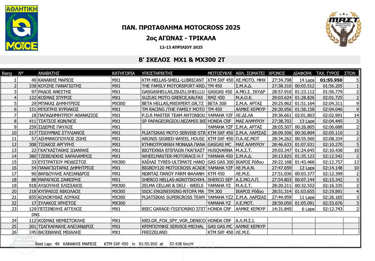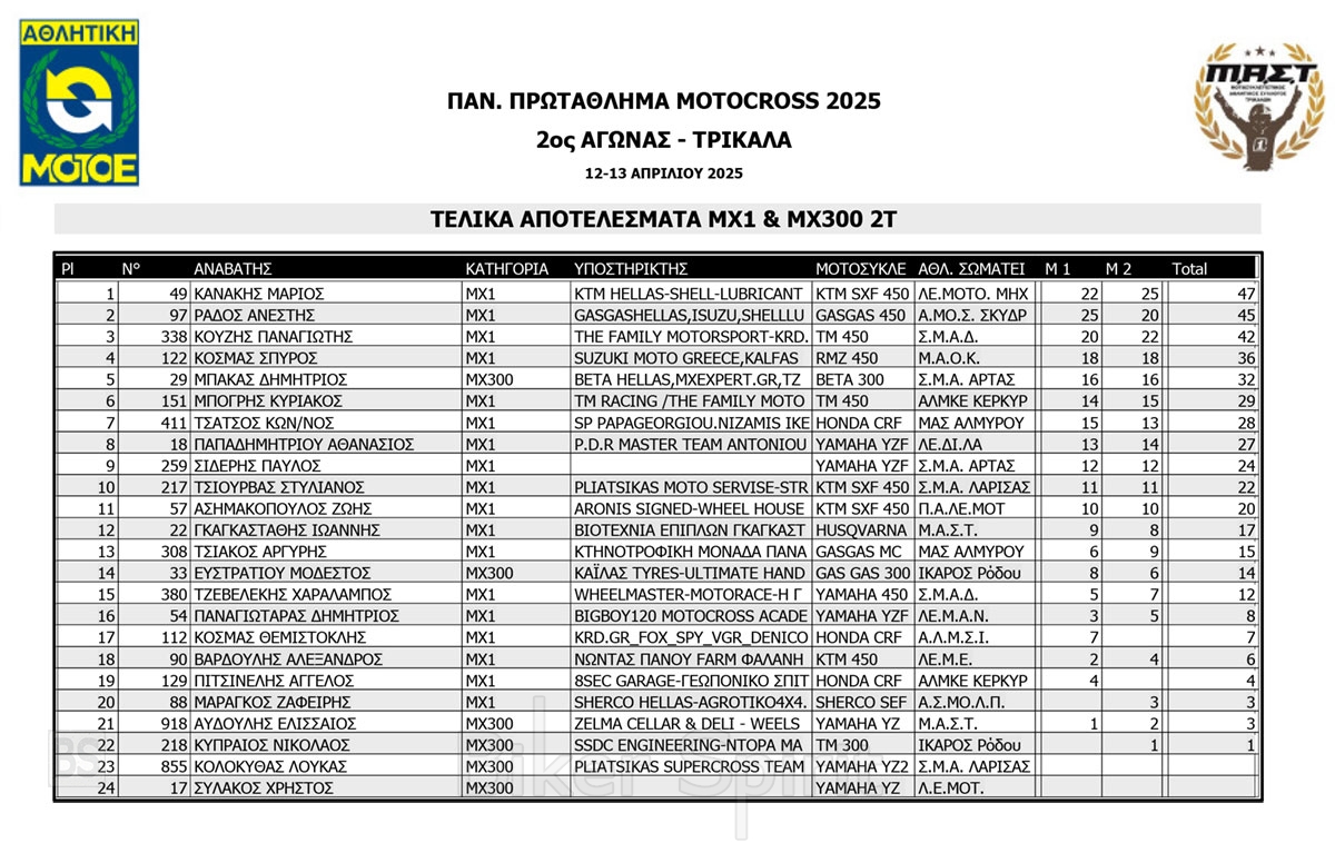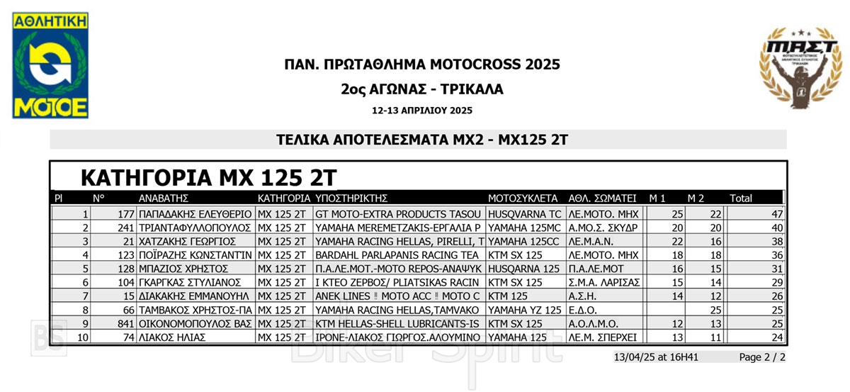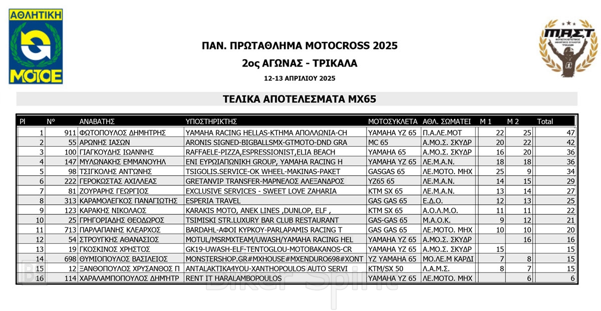 ΑΠΟΤΕΛΕΣΜΑΤΑ 2ος αγώνας Πανελλήνιου Πρωταθλήματος Motocross 2025 στα ΤΡΙΚΑΛΑ στις 12 και 13/04/2025