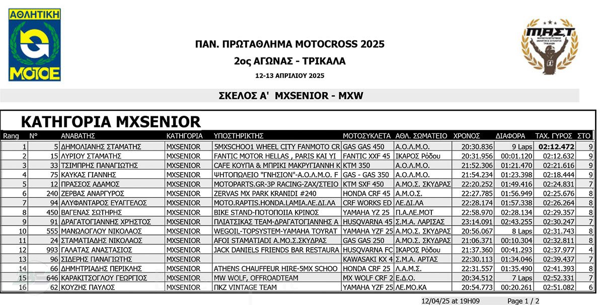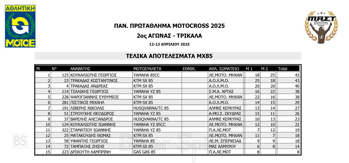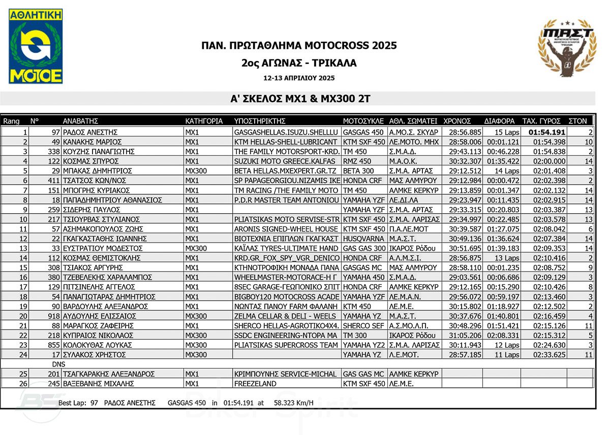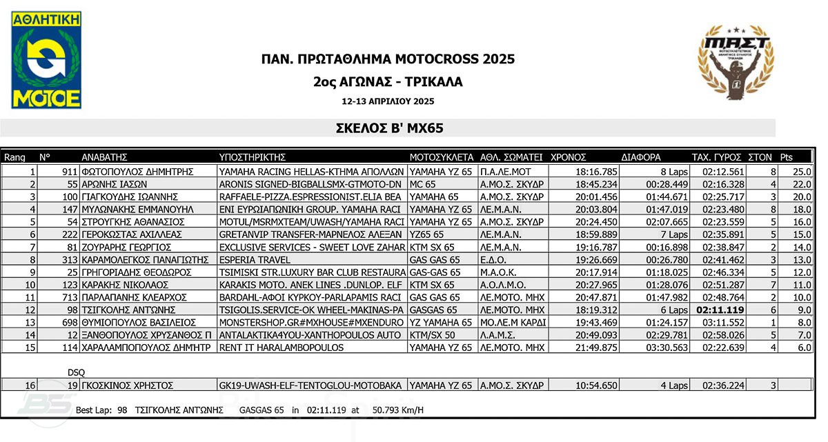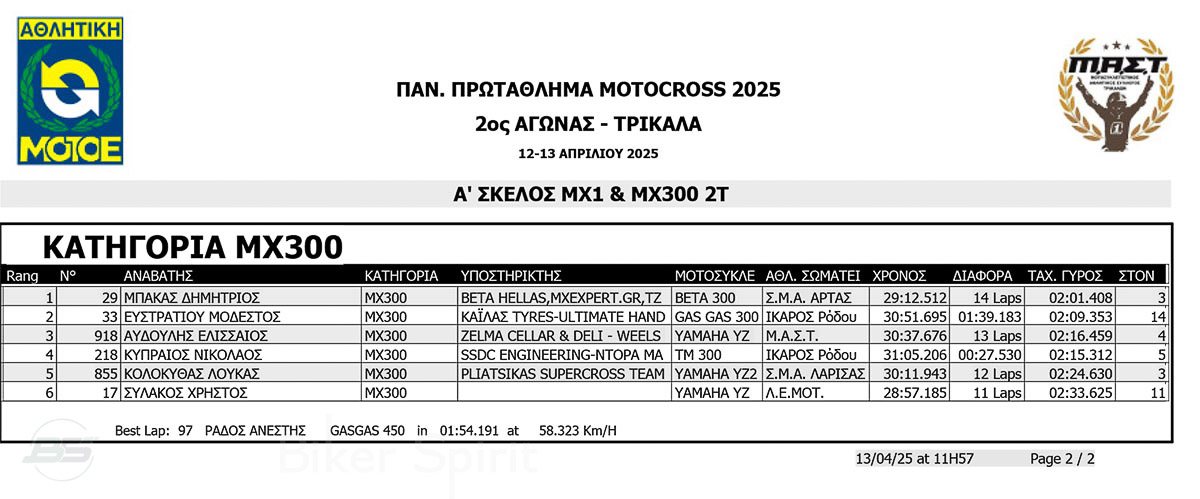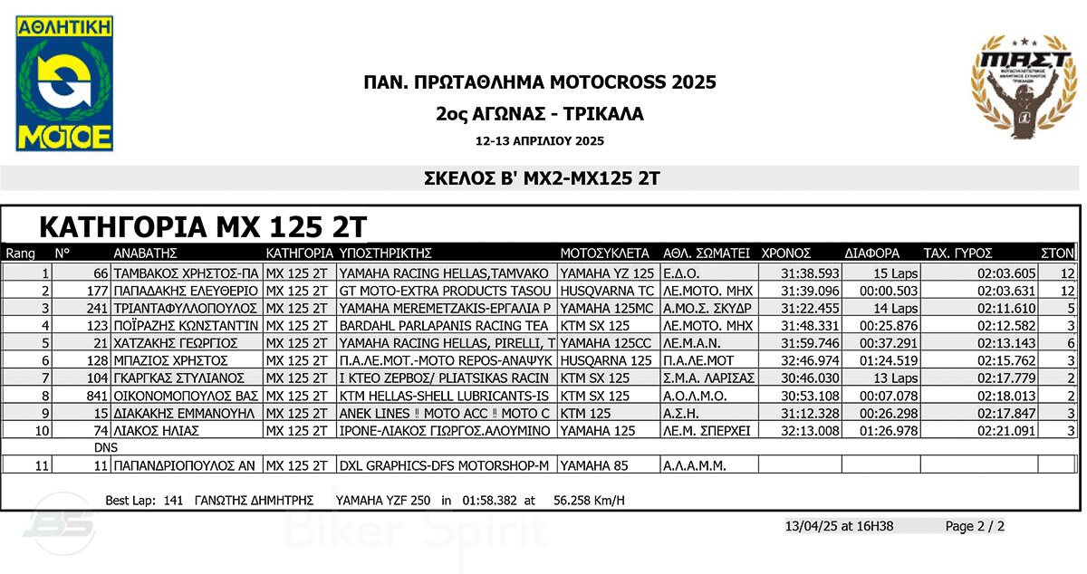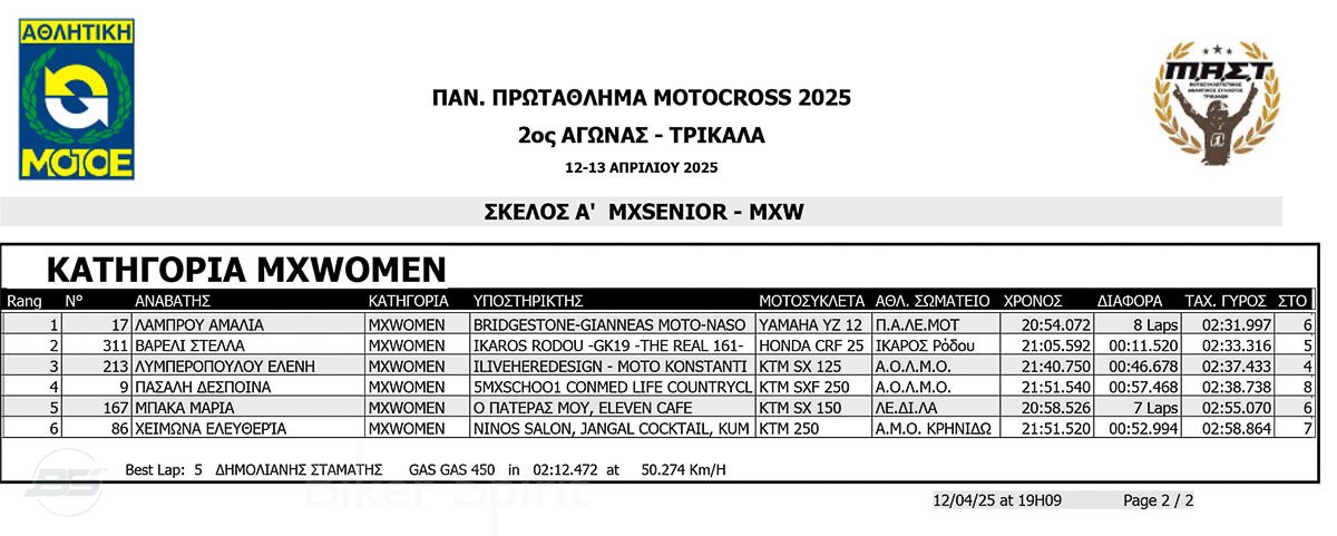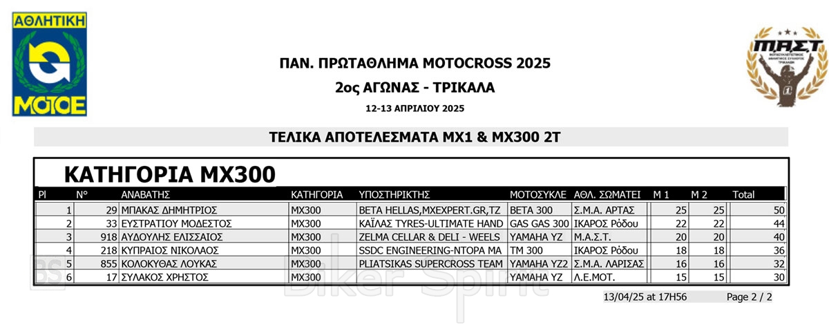 ΑΠΟΤΕΛΕΣΜΑΤΑ 2ος αγώνας Πανελλήνιου Πρωταθλήματος Motocross 2025 στα ΤΡΙΚΑΛΑ στις 12 και 13/04/2025