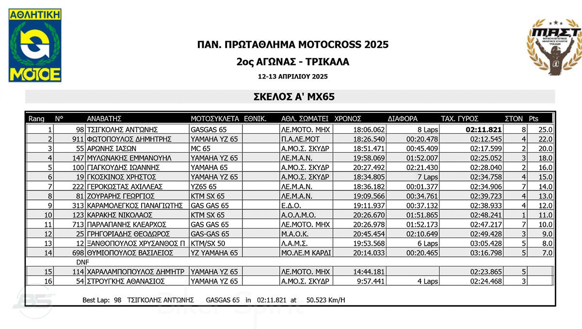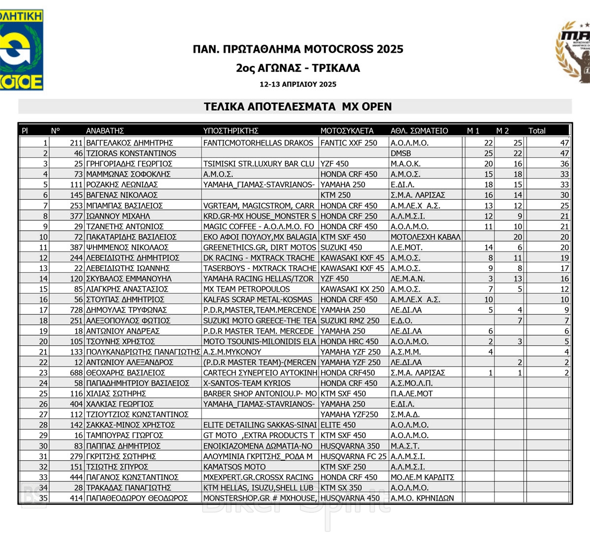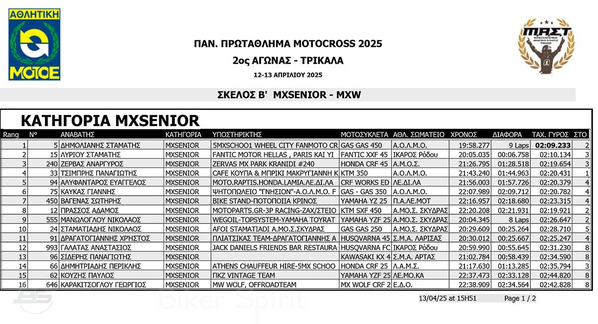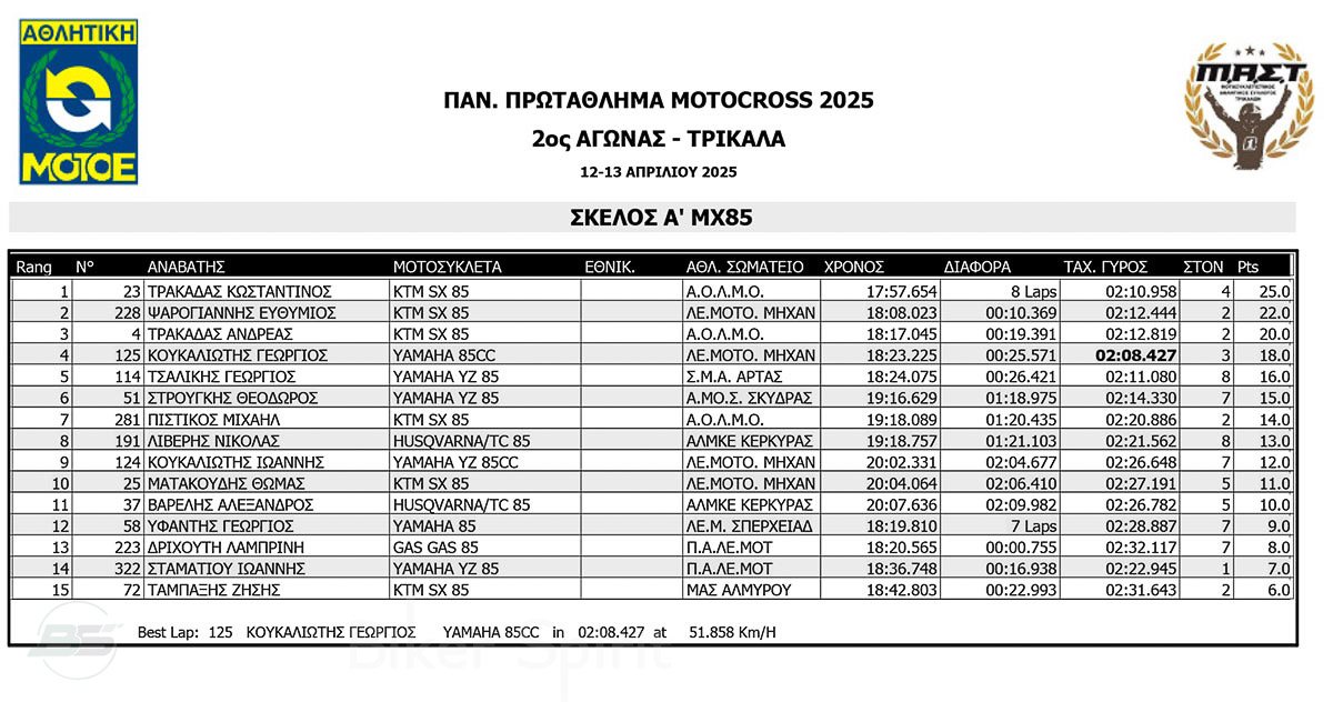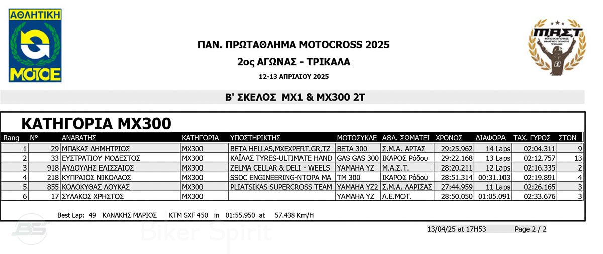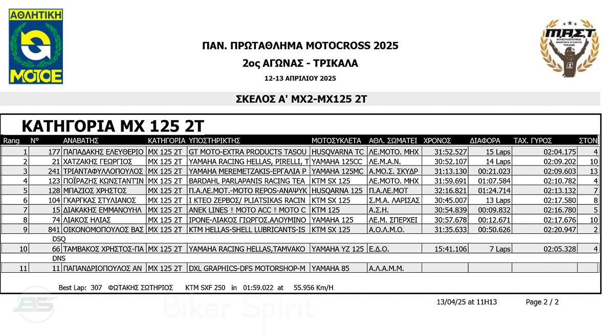 ΑΠΟΤΕΛΕΣΜΑΤΑ 2ος αγώνας Πανελλήνιου Πρωταθλήματος Motocross 2025 στα ΤΡΙΚΑΛΑ στις 12 και 13/04/2025