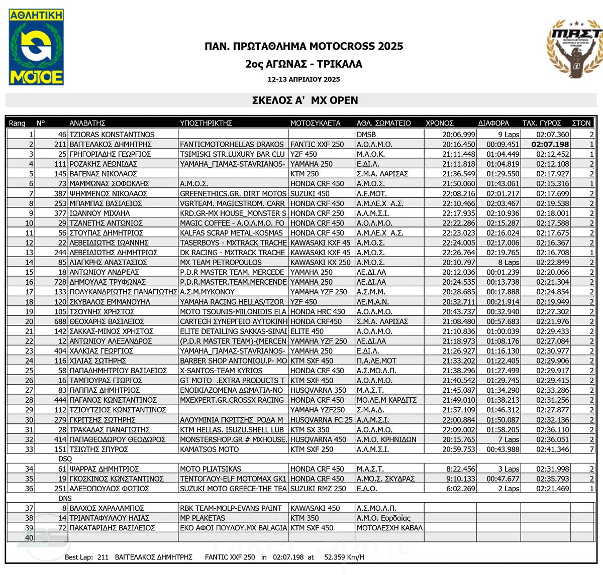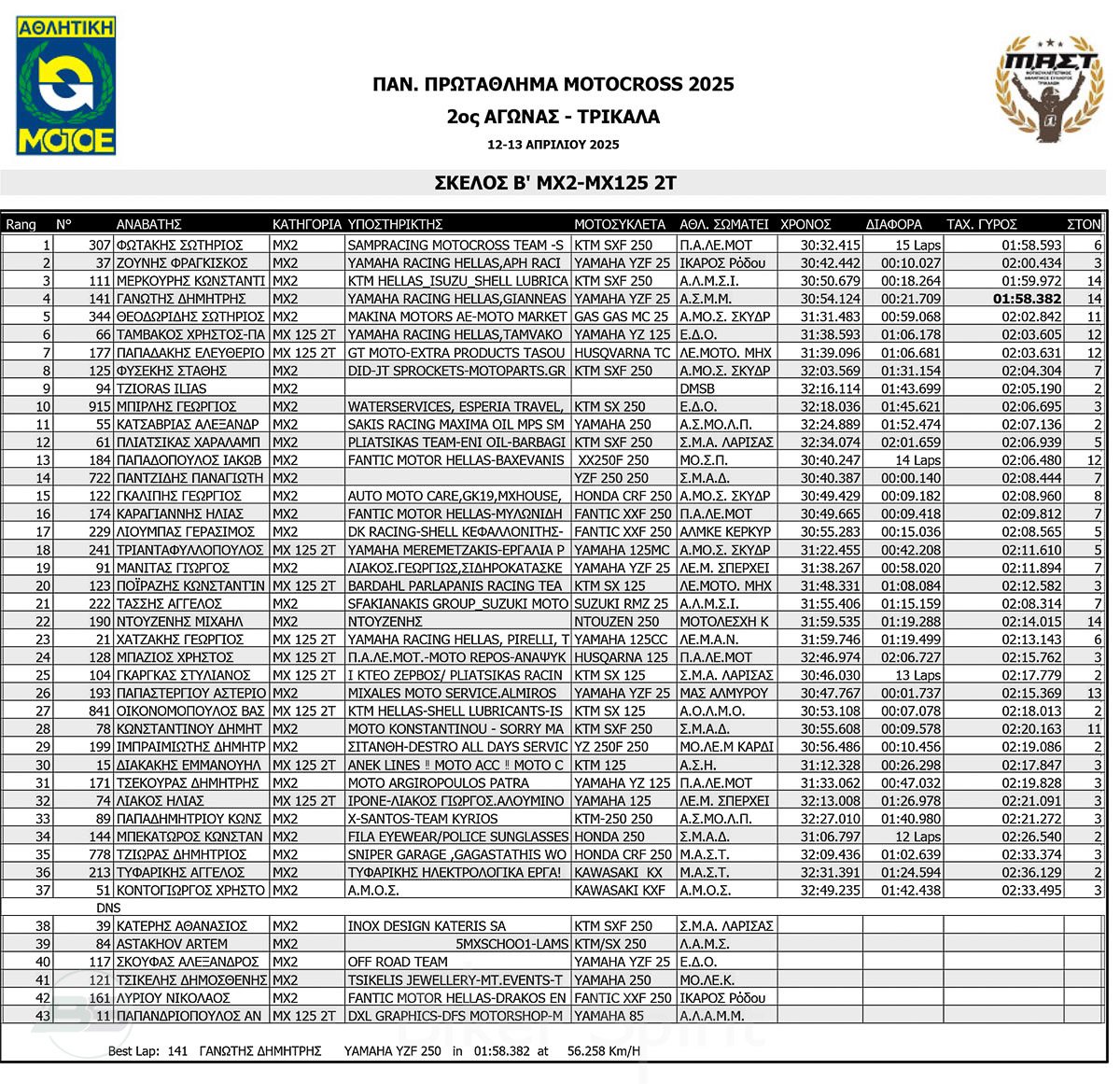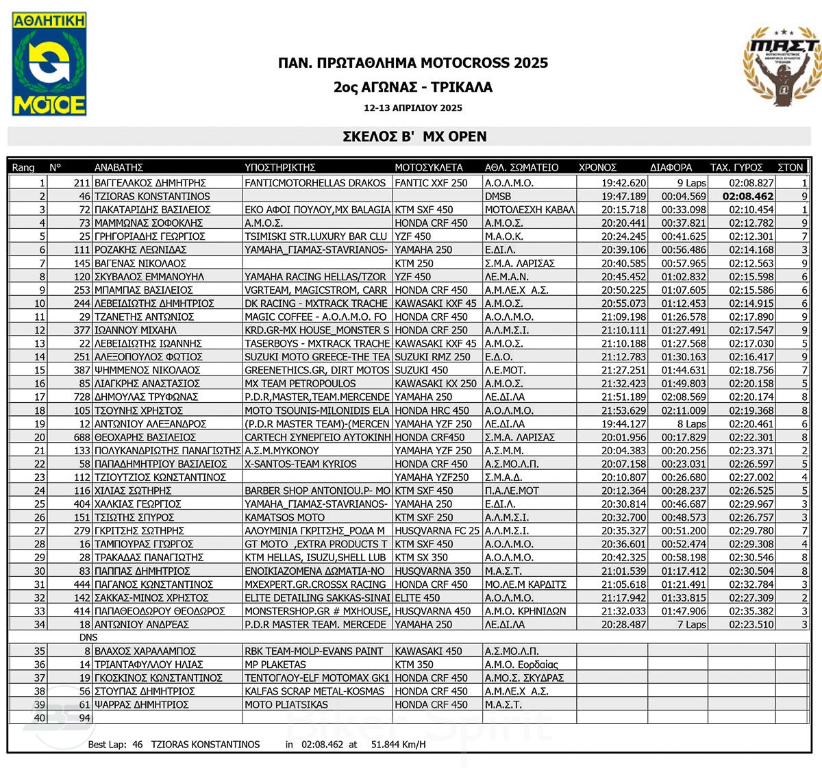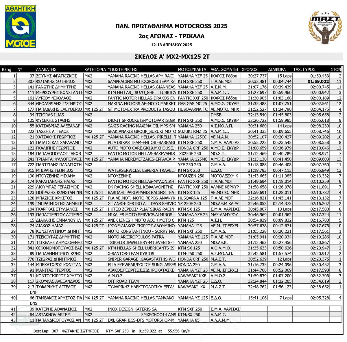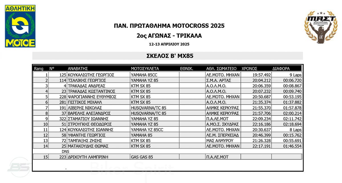 ΑΠΟΤΕΛΕΣΜΑΤΑ 2ος αγώνας Πανελλήνιου Πρωταθλήματος Motocross 2025 στα ΤΡΙΚΑΛΑ στις 12 και 13/04/2025