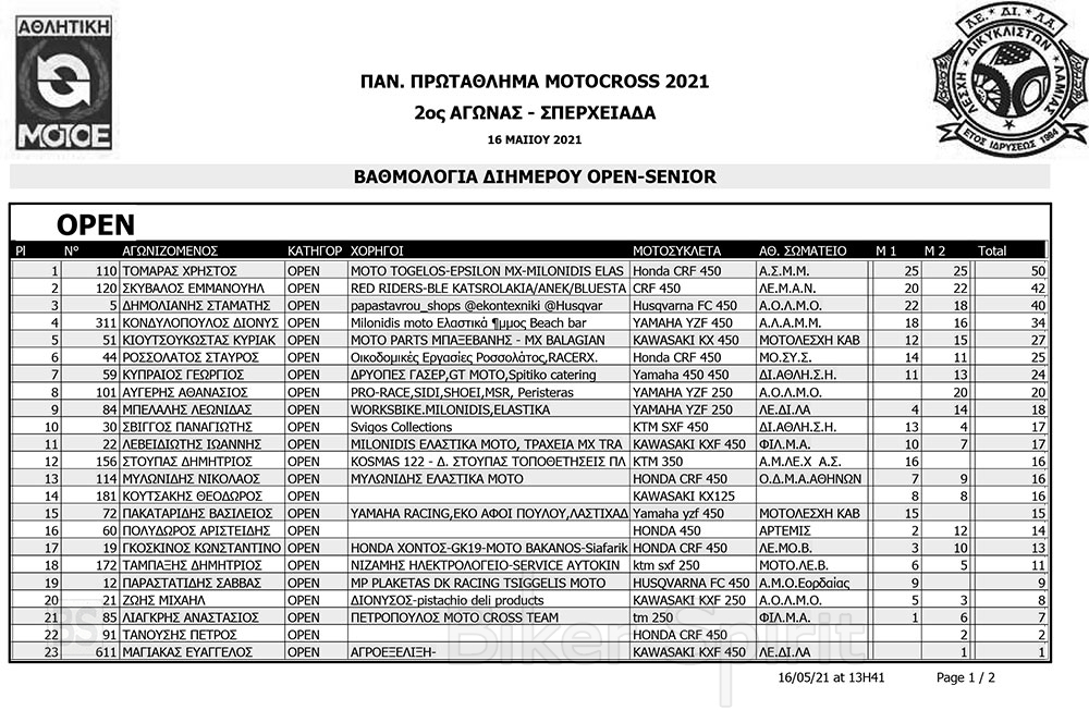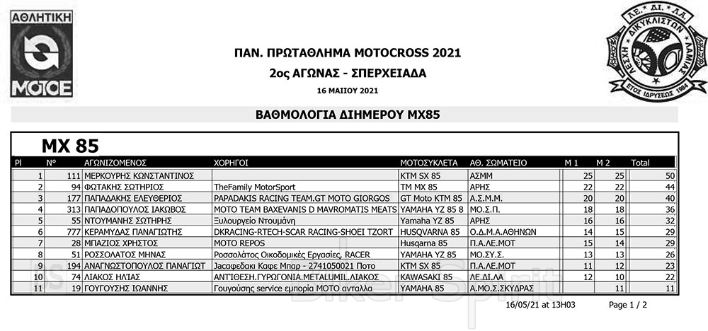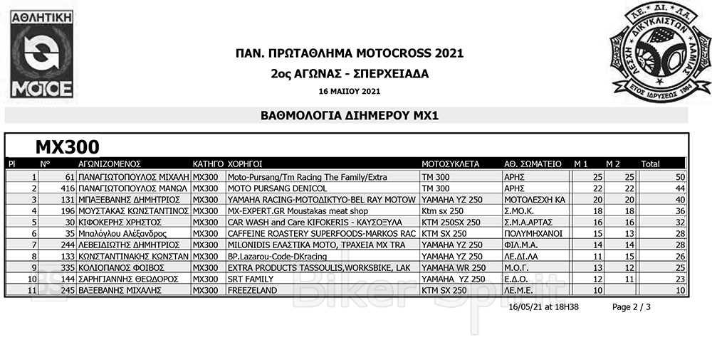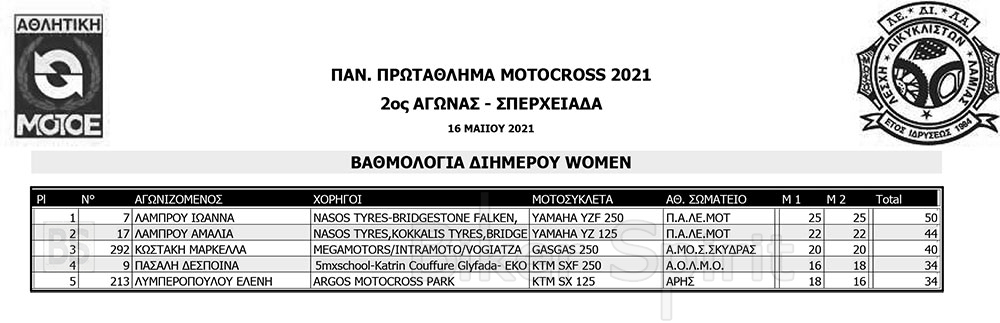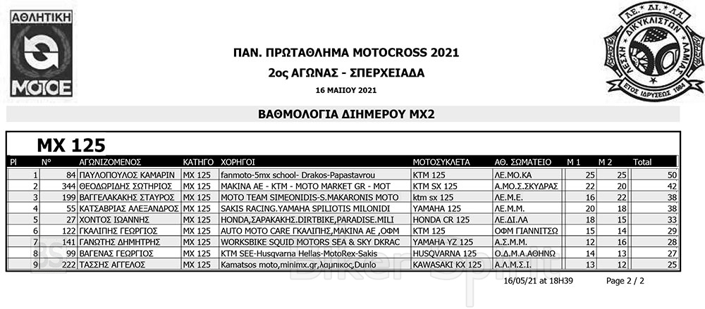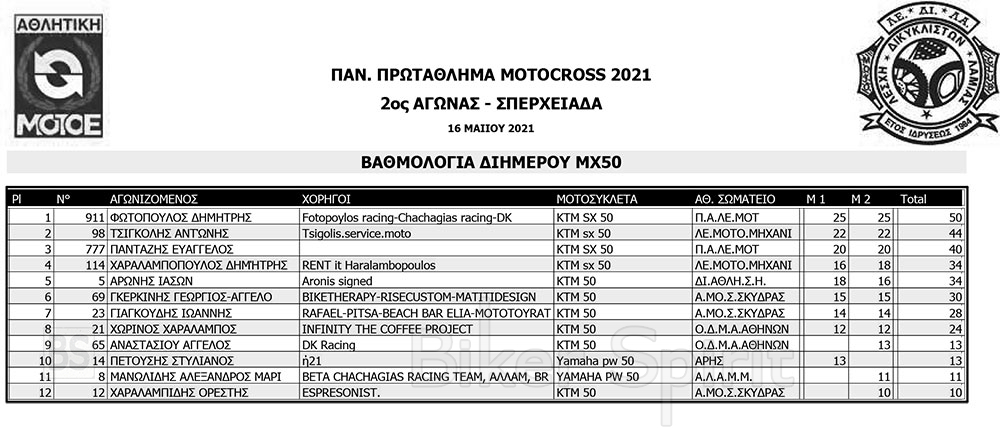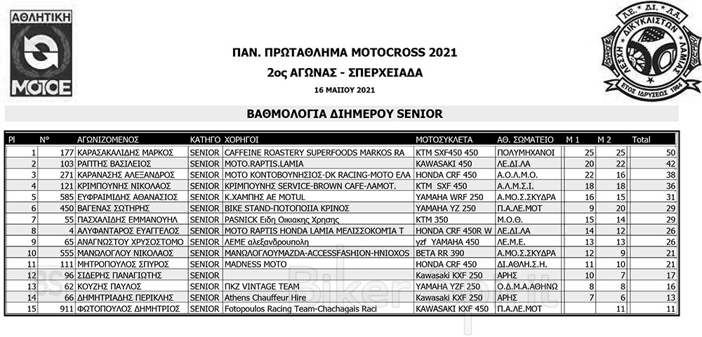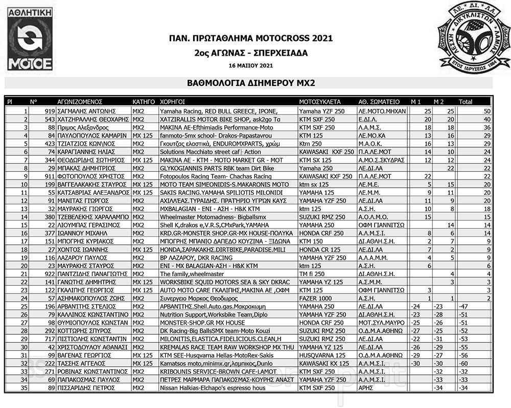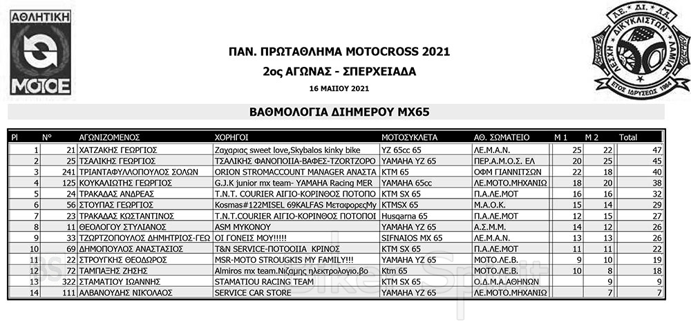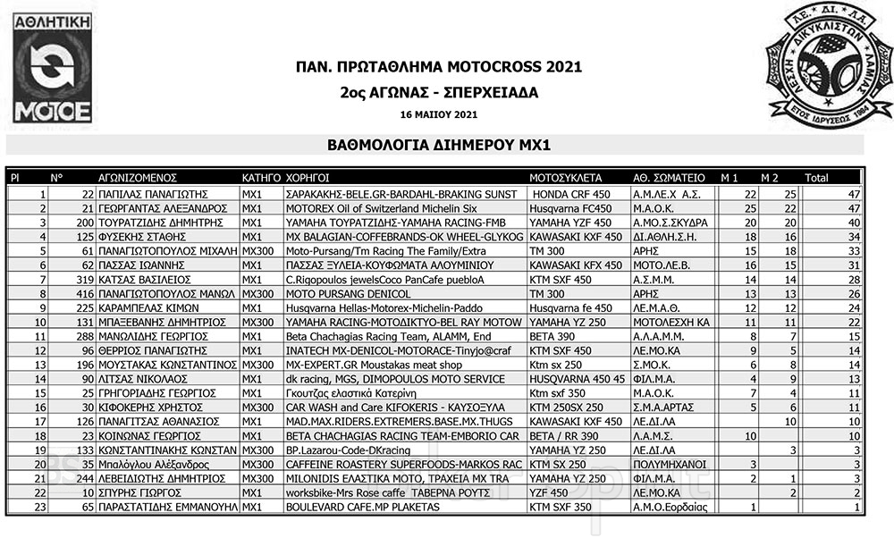 ΑΠΟΤΕΛΕΣΜΑΤΑ 2ου Αγώνα Παν. Πρωτ. Motocross 2021 στην Σπερχειάδα με νικητές Παπίλα και Σάγμαλη