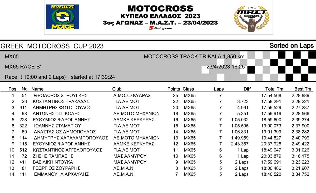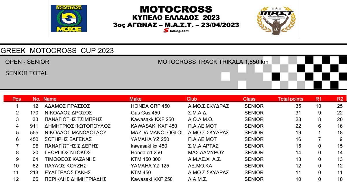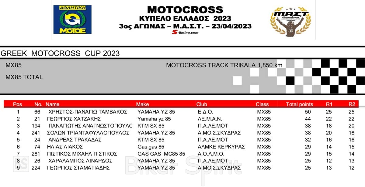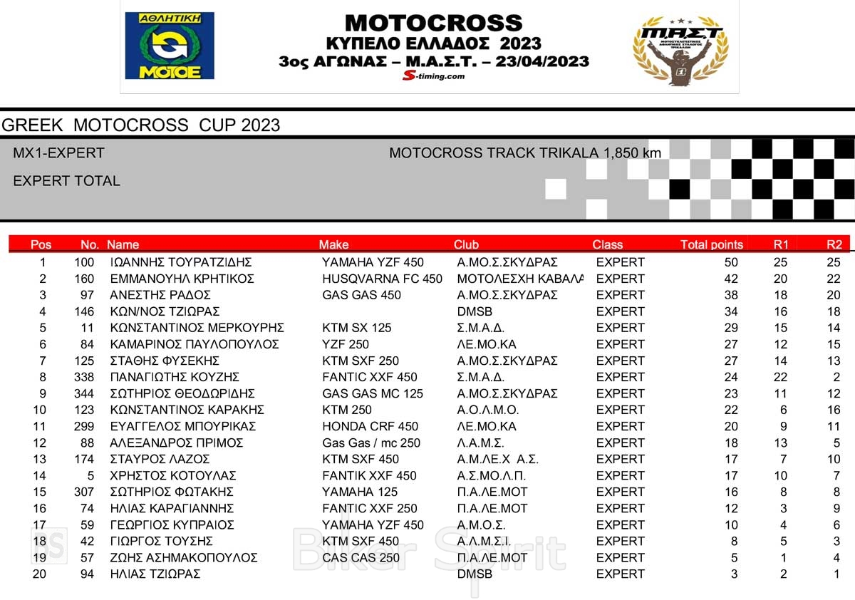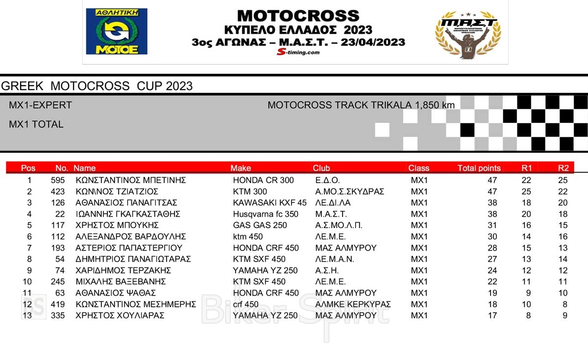 ΑΠΟΤΕΛΕΣΜΑΤΑ 3ου Αγώνα Κυπέλλου Ελλάδος Motocross 2023 στα ΤΡΙΚΑΛΑ – 23/04/2023