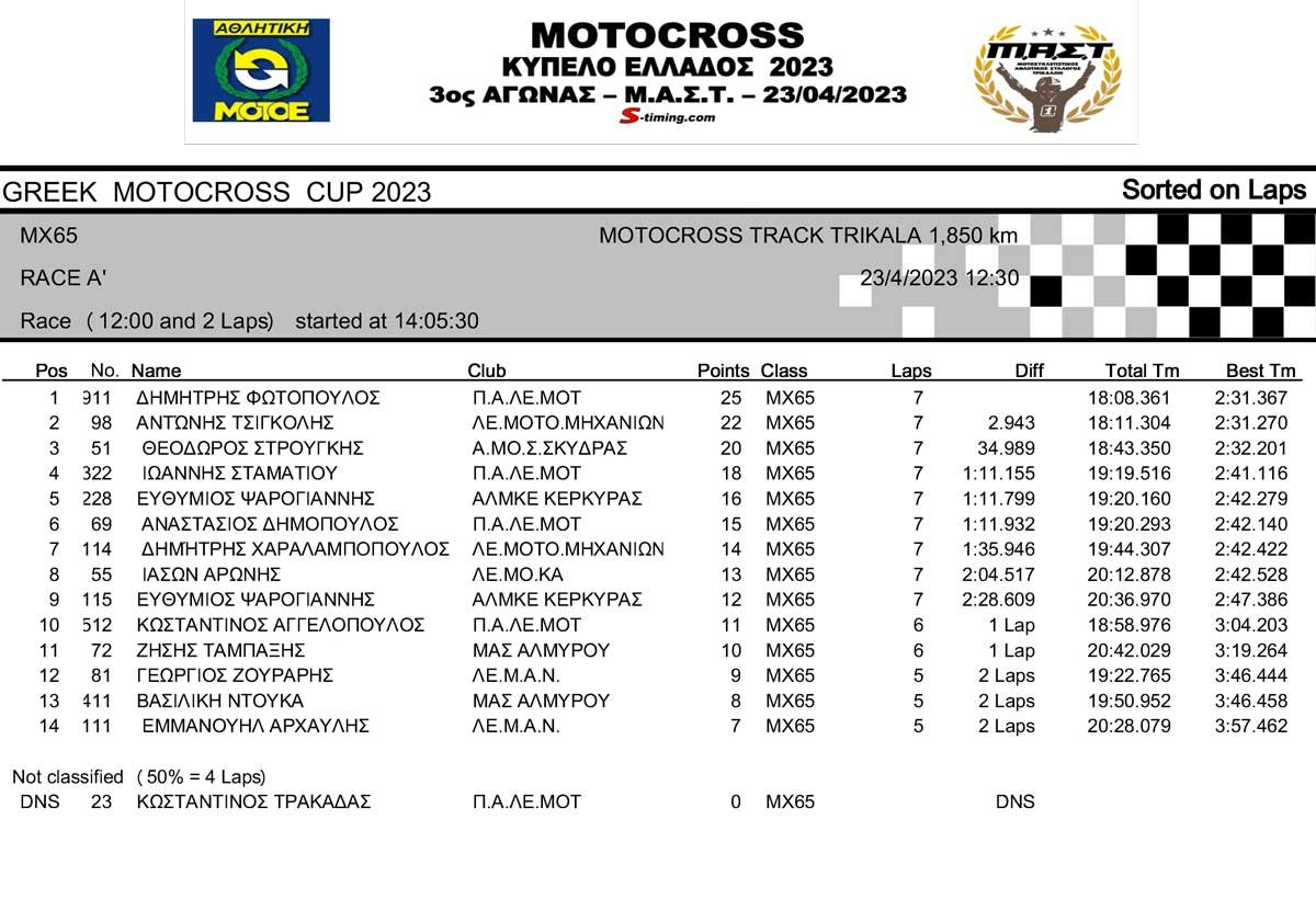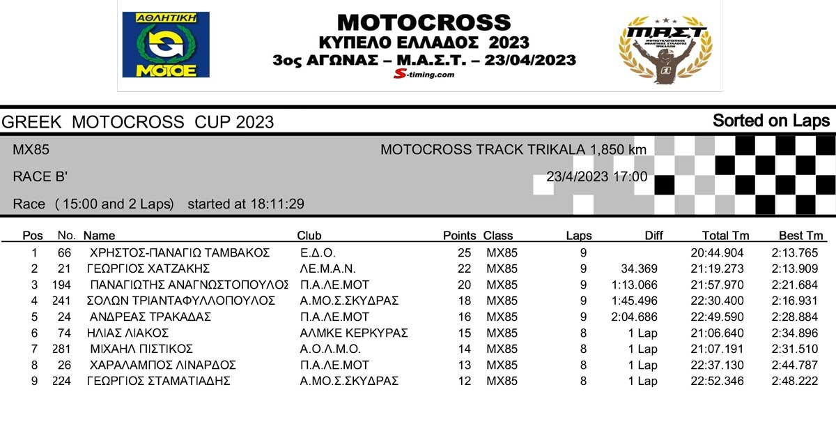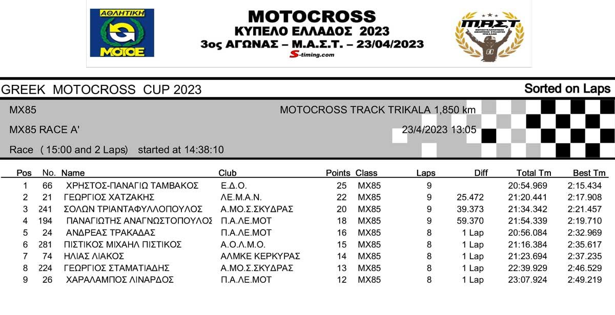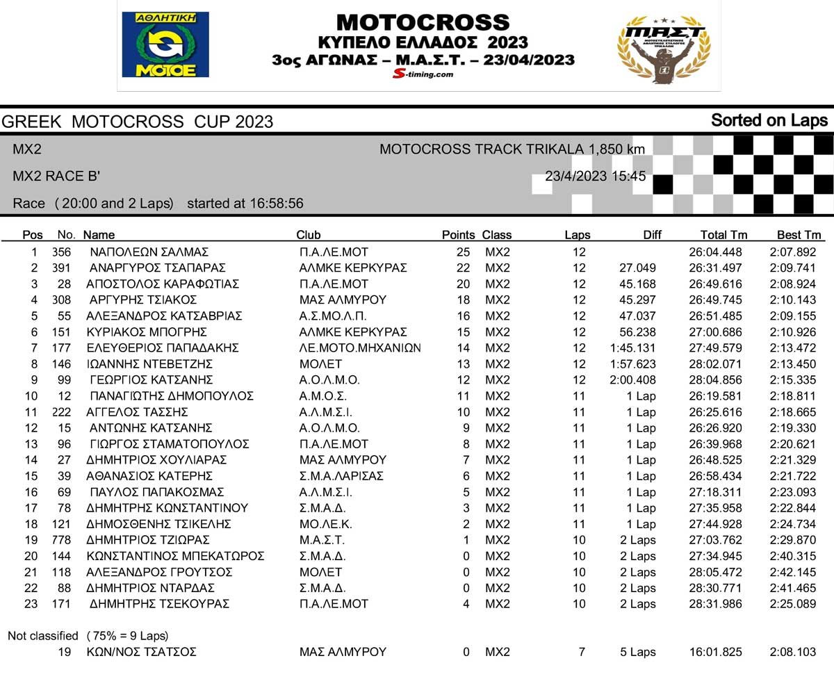 ΑΠΟΤΕΛΕΣΜΑΤΑ 3ου Αγώνα Κυπέλλου Ελλάδος Motocross 2023 στα ΤΡΙΚΑΛΑ – 23/04/2023