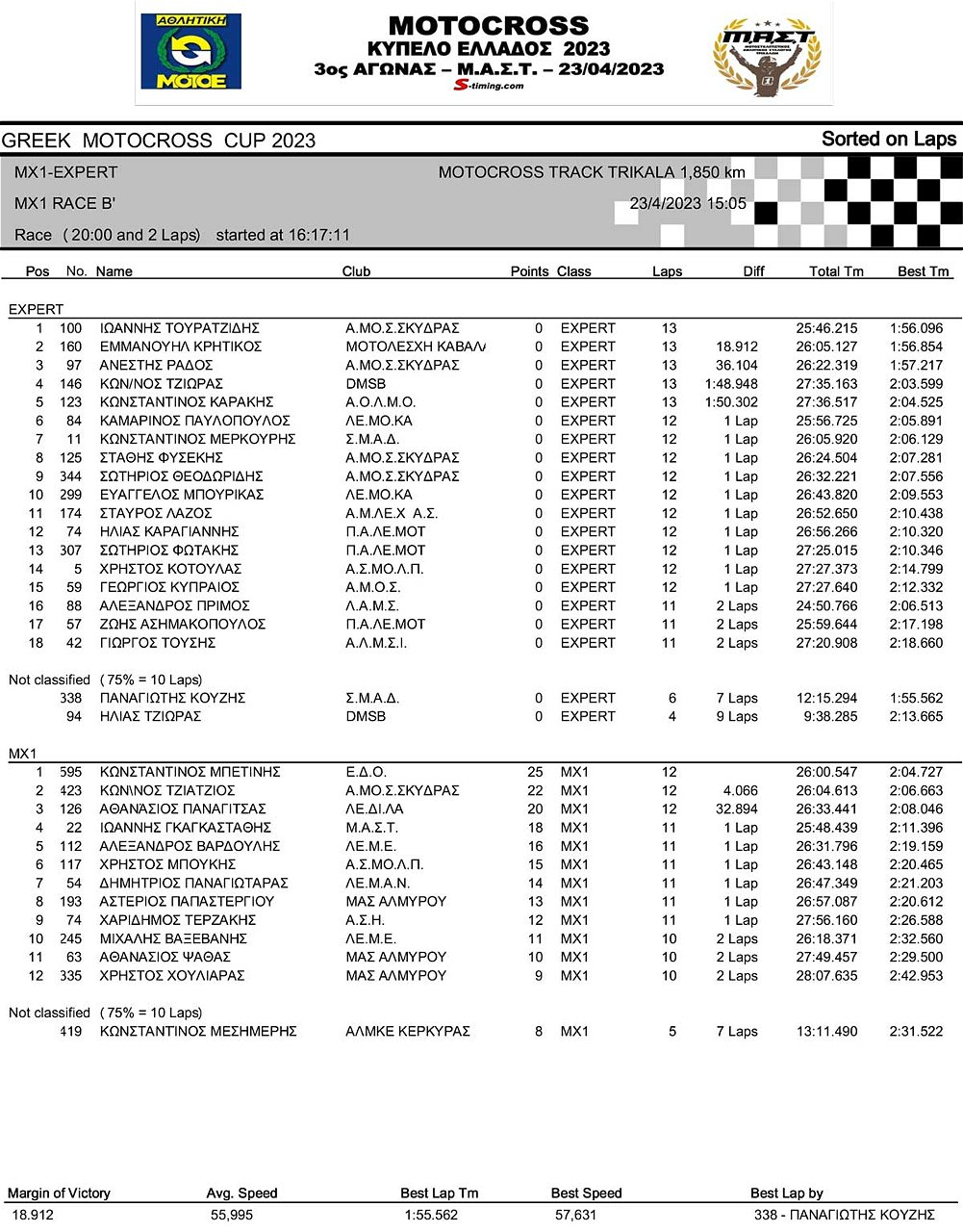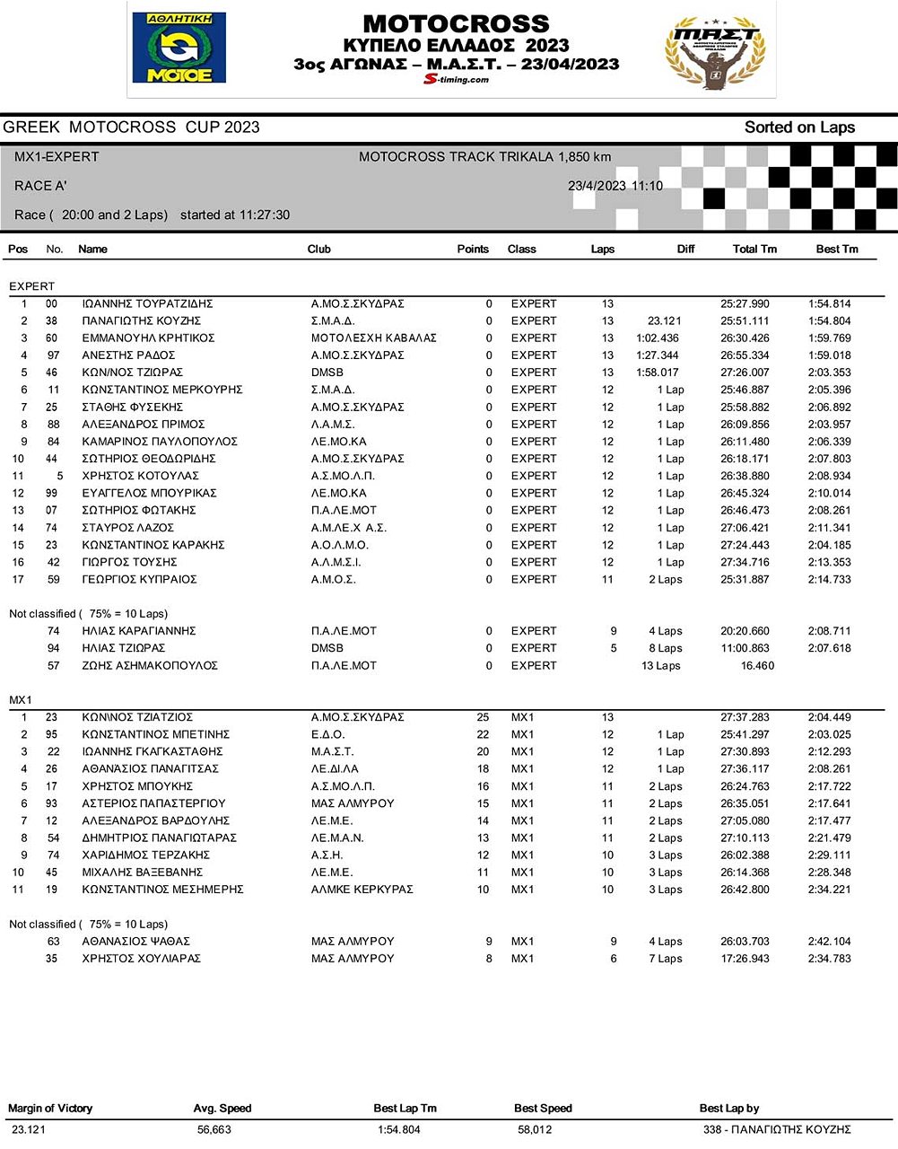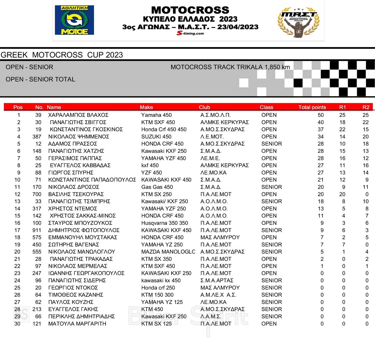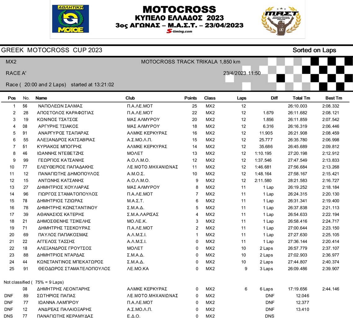 ΑΠΟΤΕΛΕΣΜΑΤΑ 3ου Αγώνα Κυπέλλου Ελλάδος Motocross 2023 στα ΤΡΙΚΑΛΑ – 23/04/2023