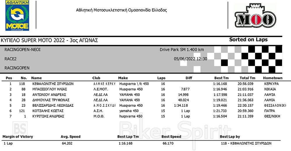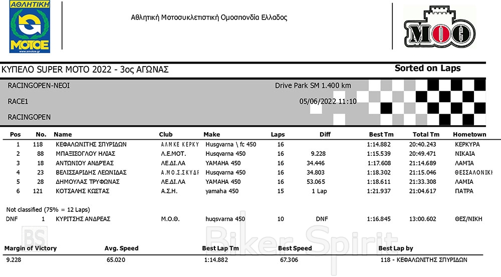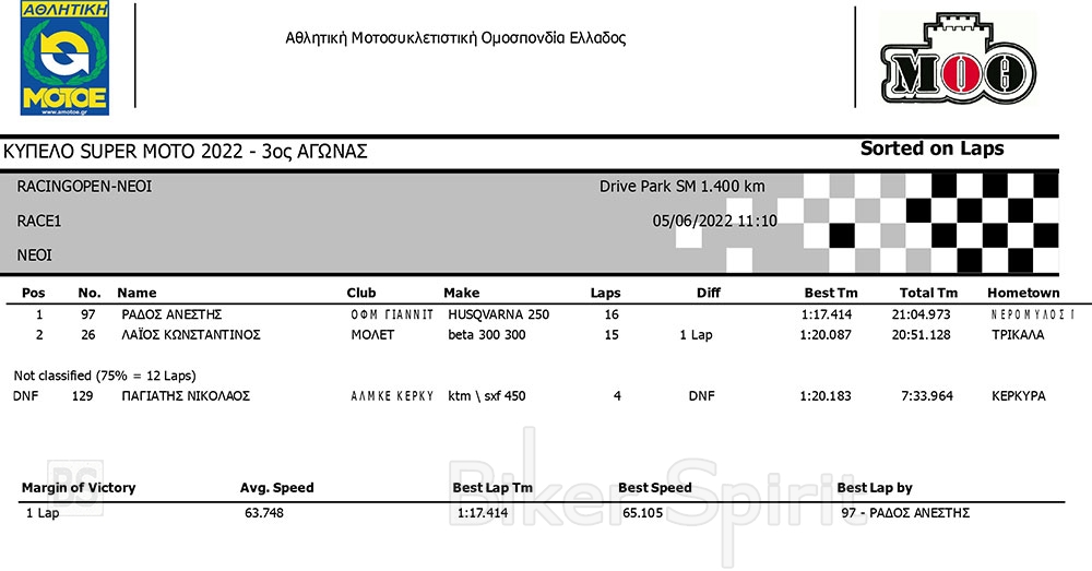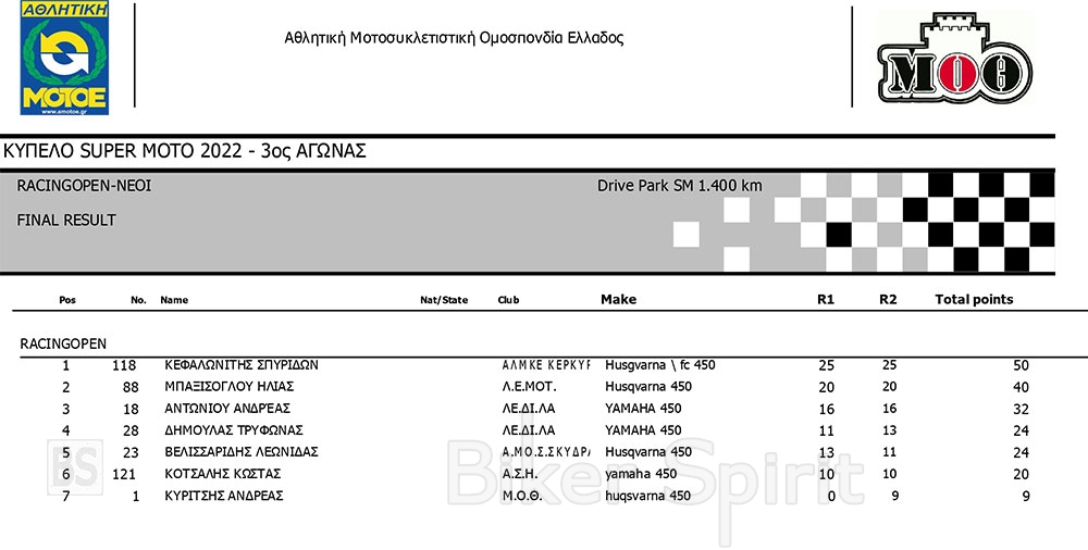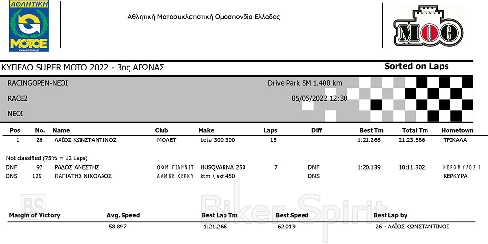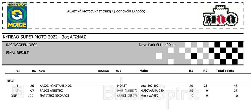ΑΠΟΤΕΛΕΣΜΑΤΑ 3ου αγώνα Κυπέλλου Supermoto 2022 – Νέο Ρύσιο 5/6/2022