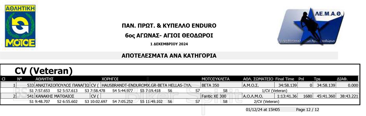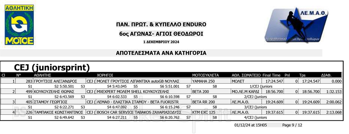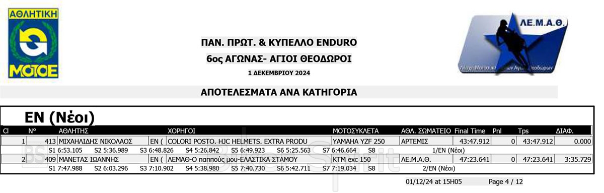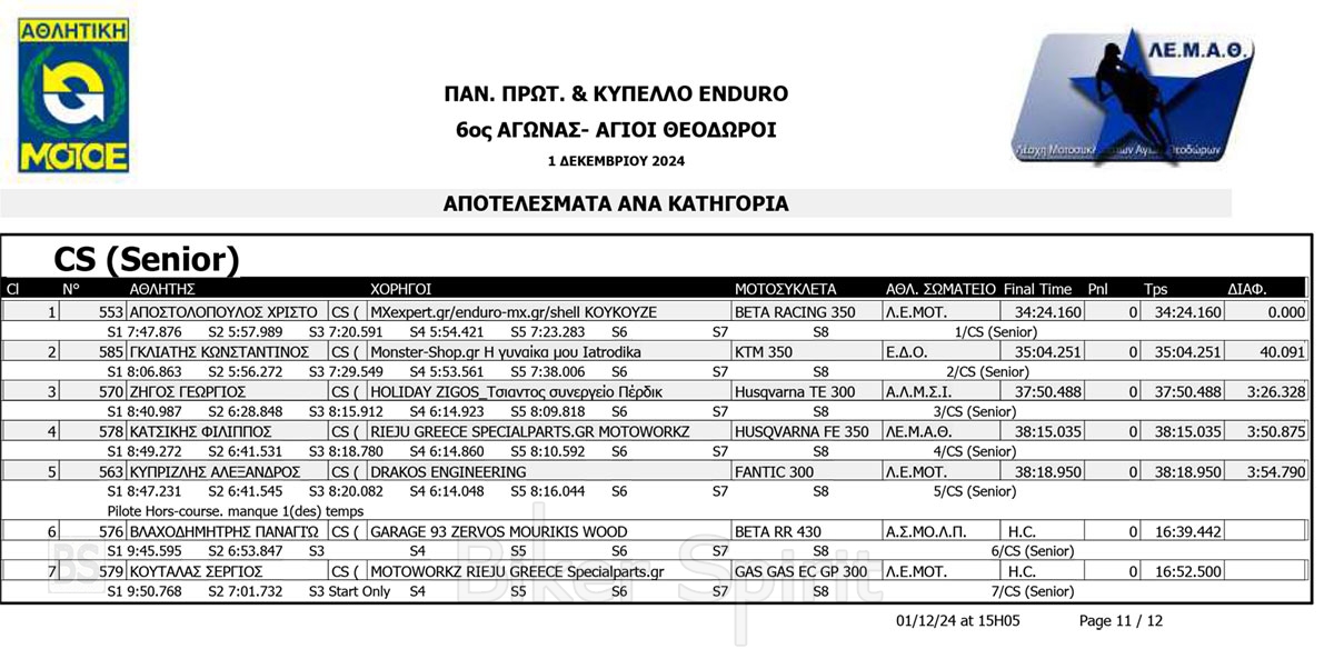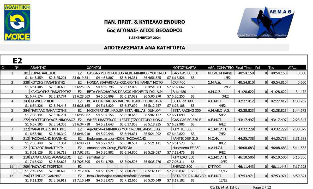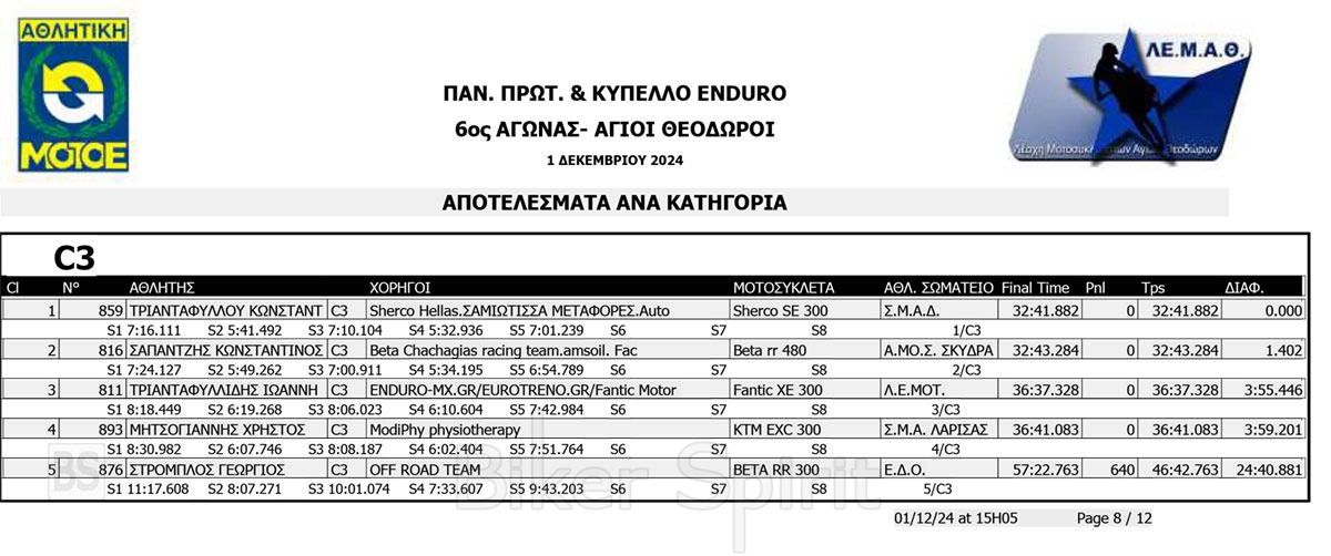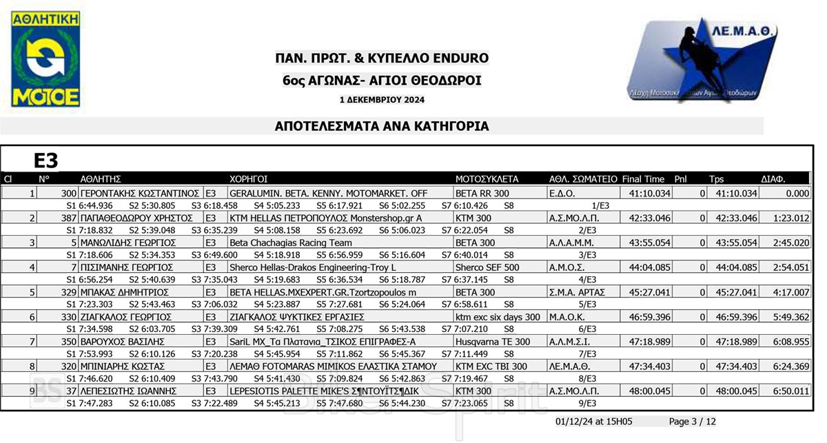ΑΠΟΤΕΛΕΣΜΑΤΑ 2ος-3ος Αγώνας Πανελλήνιο Πρωτάθλημα ENDURO και ΚΥΠΕΛΛΟ ENDURO 2024 – Σπάρτη