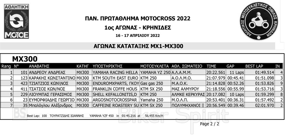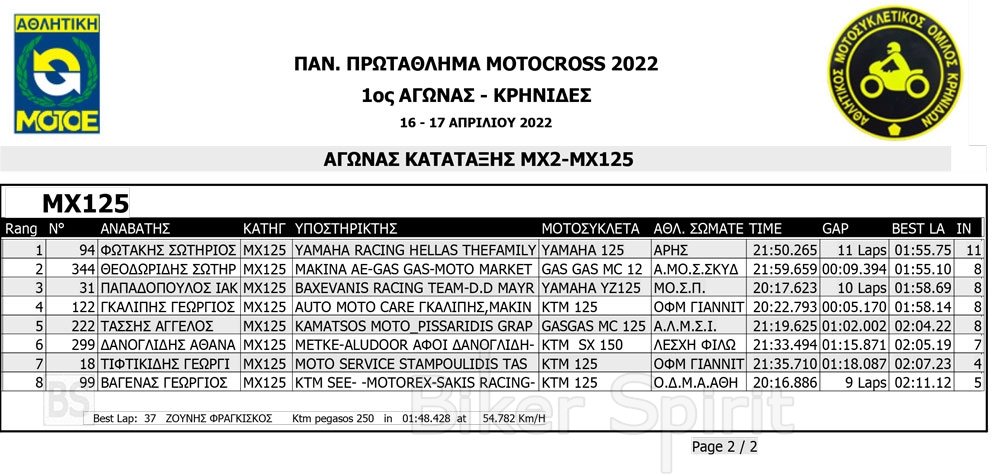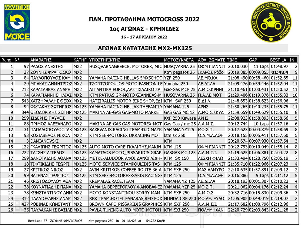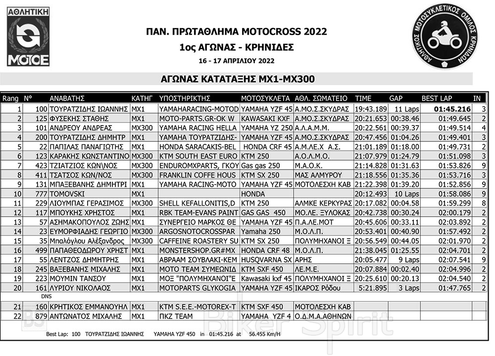 Σήμερα Σάββατο 16/4/2022 έγιναν οι αγώνες κατάταξης των κατηγοριών MX1, MX2, ΜΧ125 και MX300, και τα πρώτα σκέλη των κατηγοριών MX65 και MX85 MXWOMEN και OPEN – SENIOR