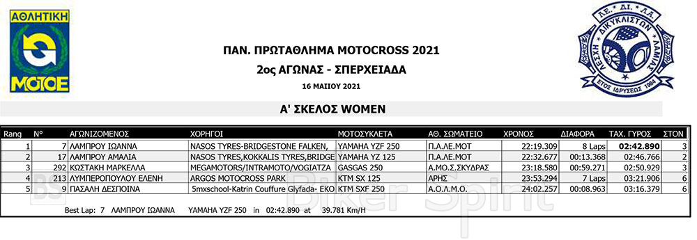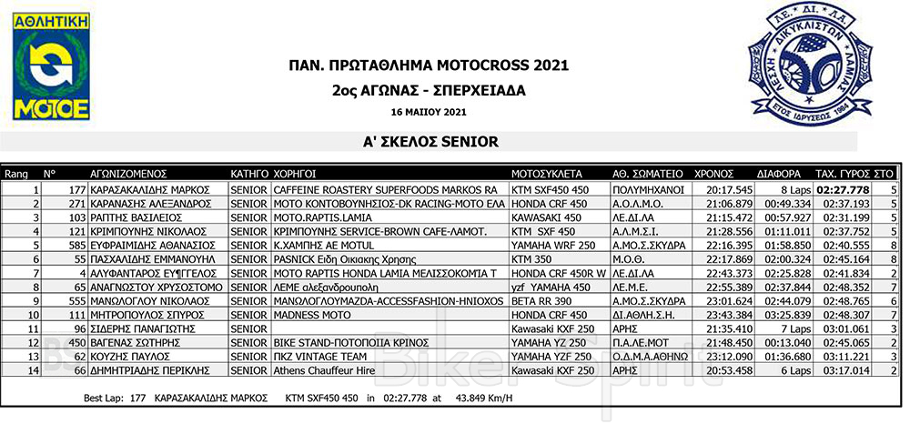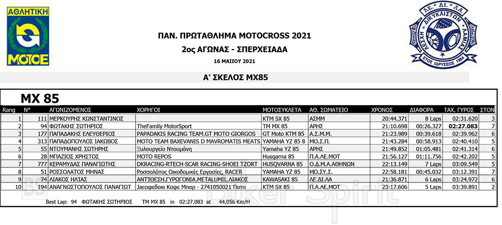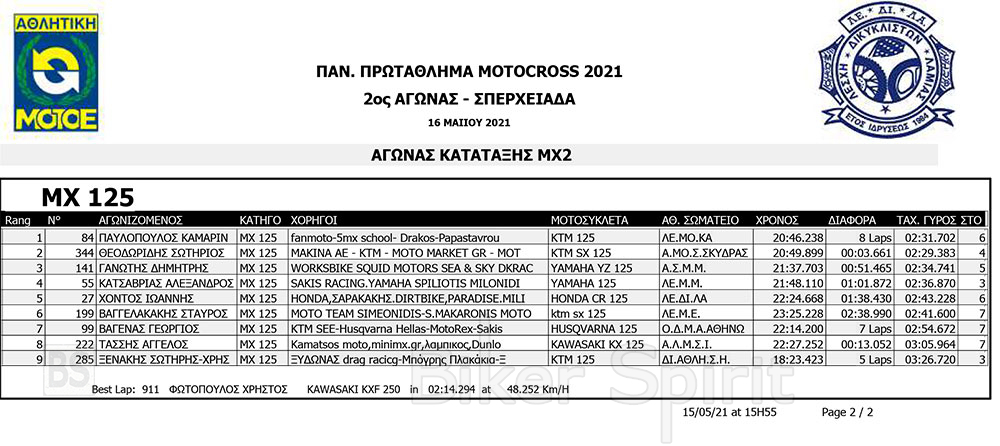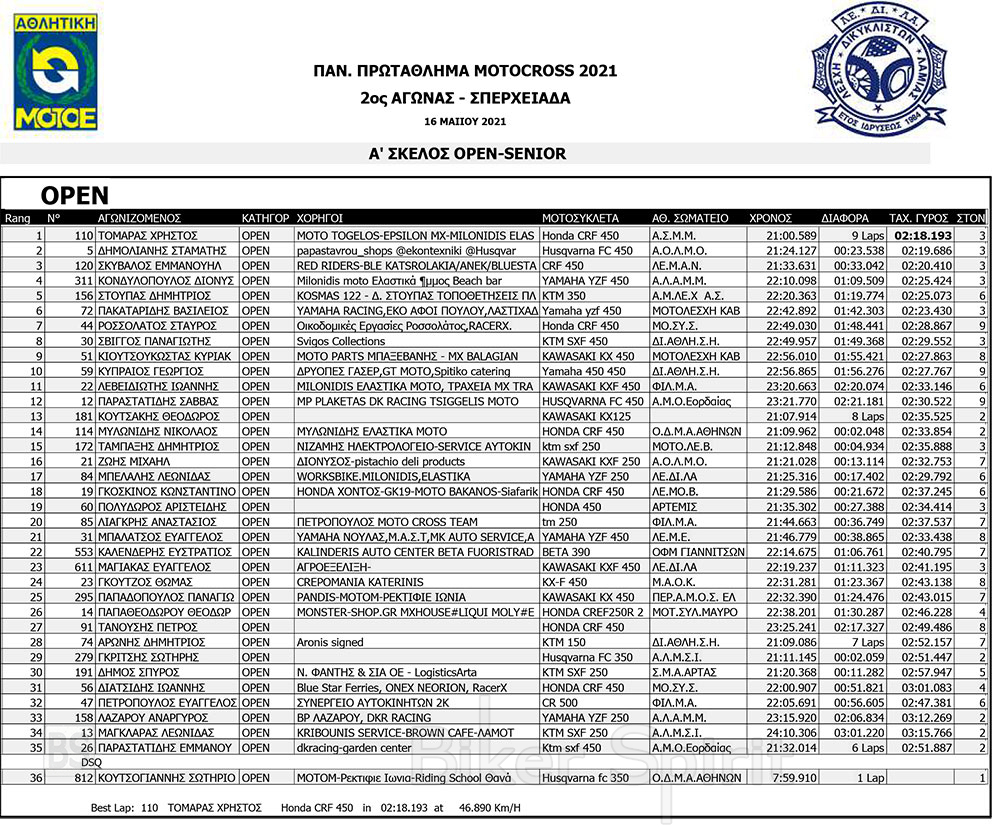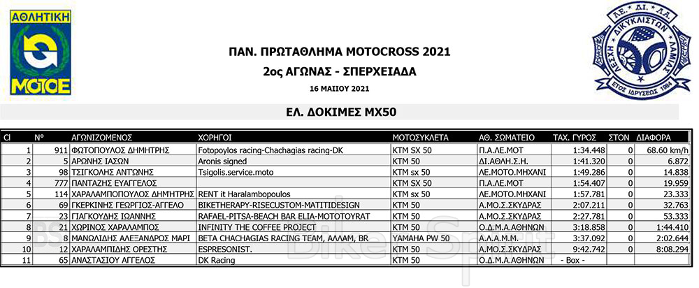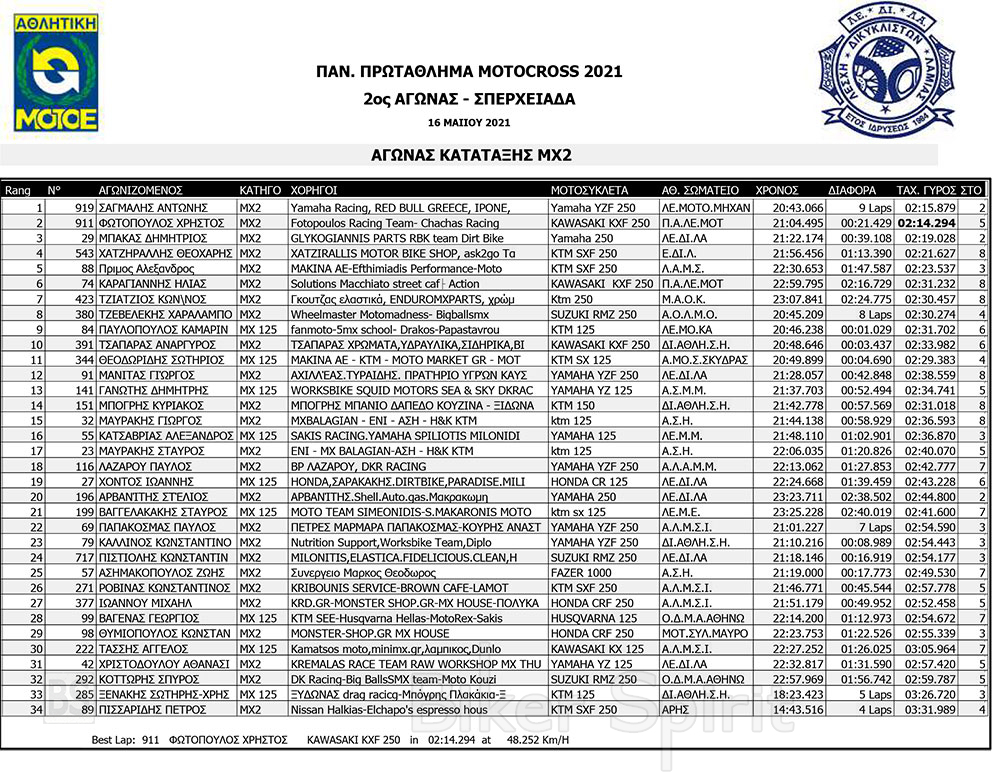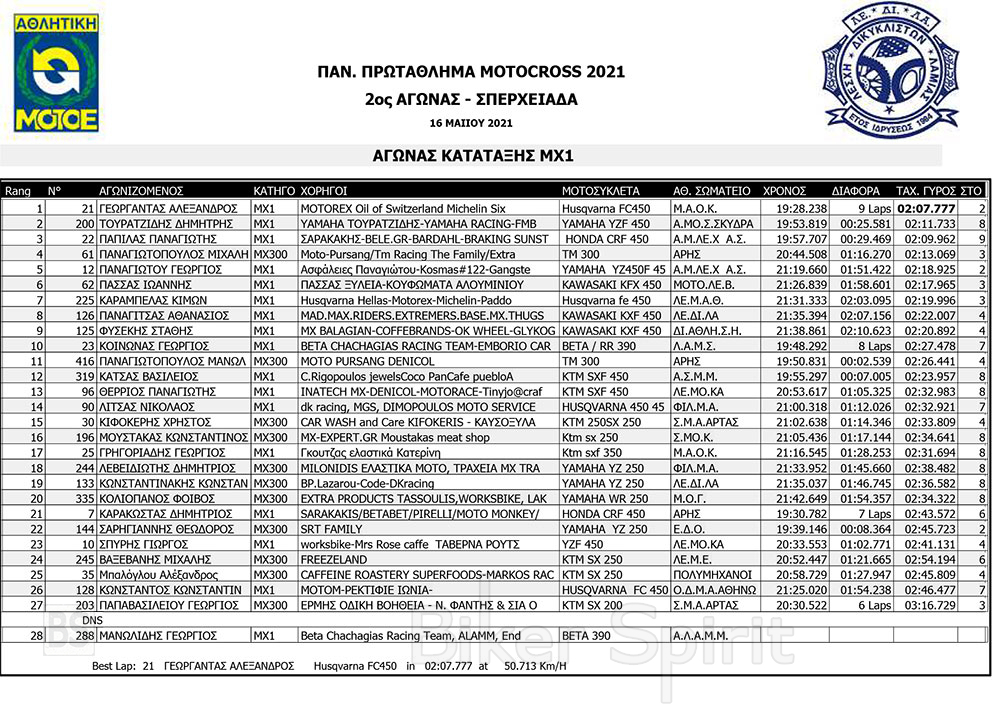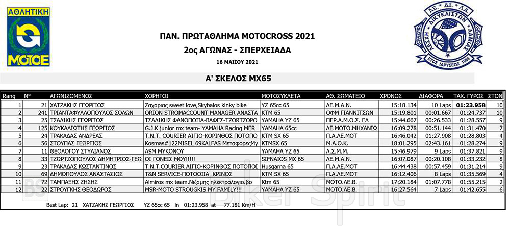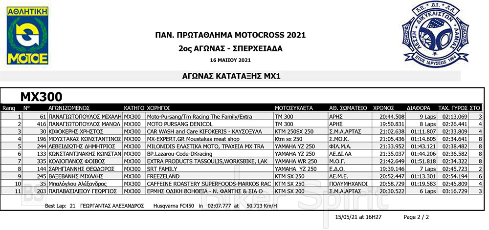 Σήμερα Σάββατο 15/5/2021 έγιναν οι αγώνες κατάταξης των κατηγοριών MX1, MX2, ΜΧ125 και MX300, και τα πρώτα σκέλη των κατηγοριών MX65 και MX85 MXWOMEN και OPEN – SENIOR