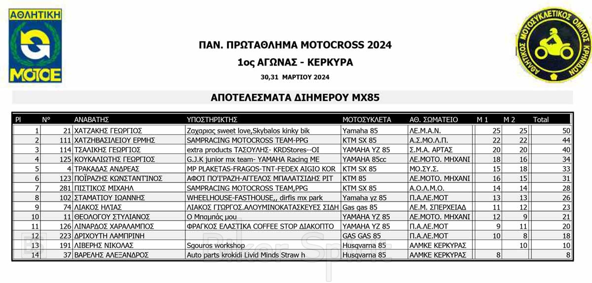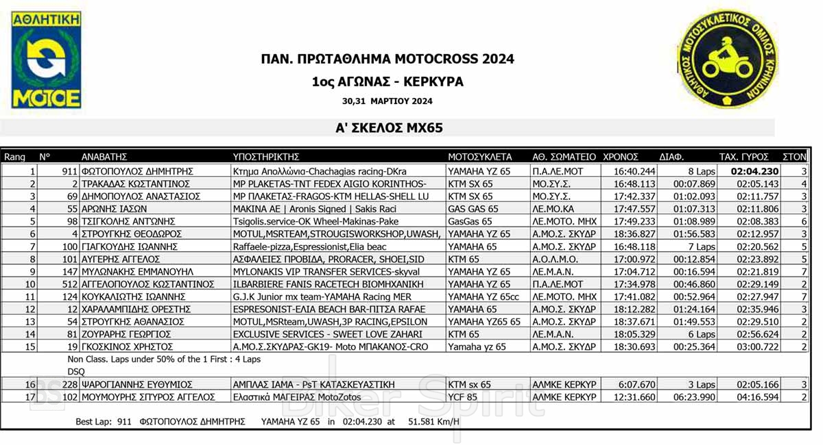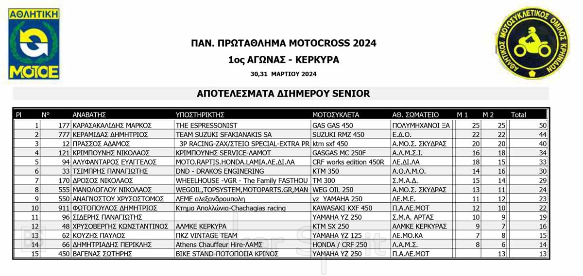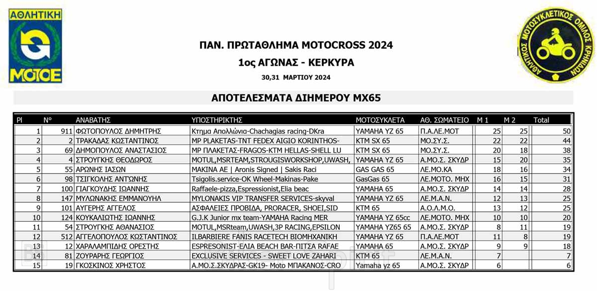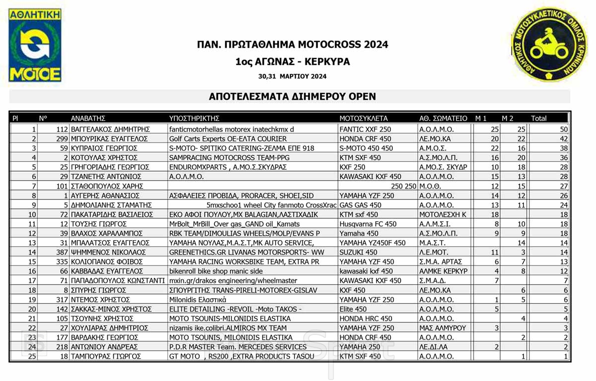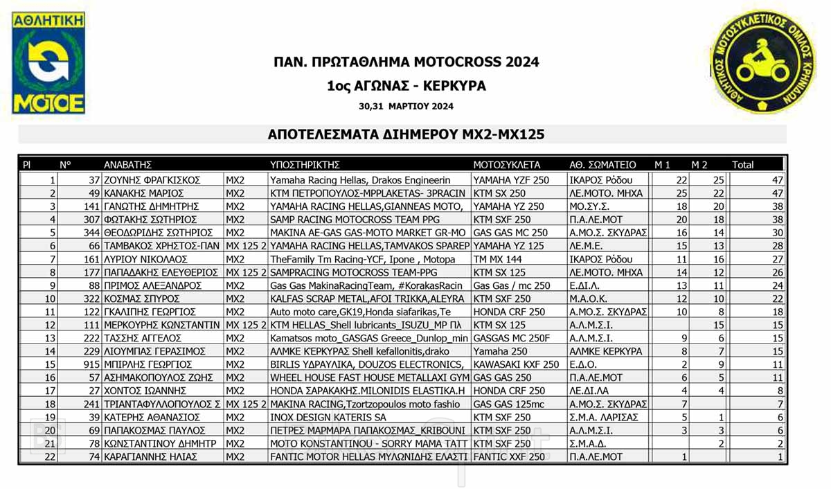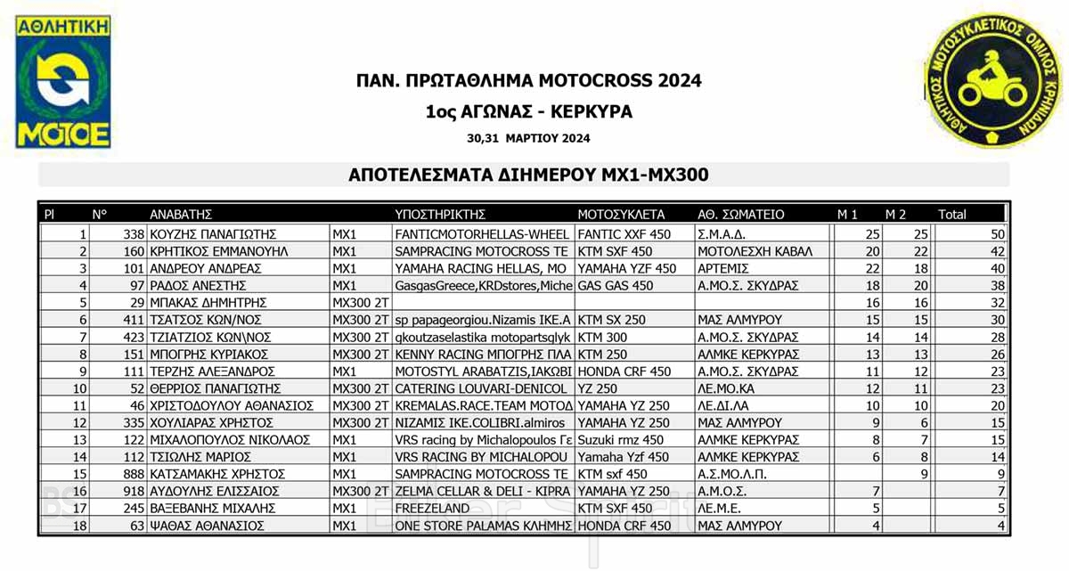 ΑΠΟΤΕΛΕΣΜΑΤΑ του 1ου αγώνα Πανελληνίου Πρωταθλήματος Motocross 2024 στην Κέρκυρα με νικητές Κουζή και Ζούνη