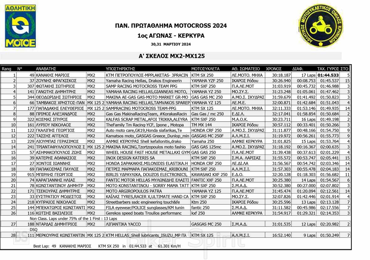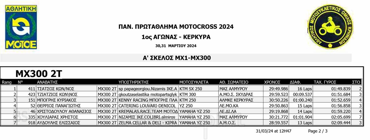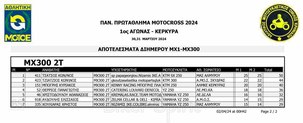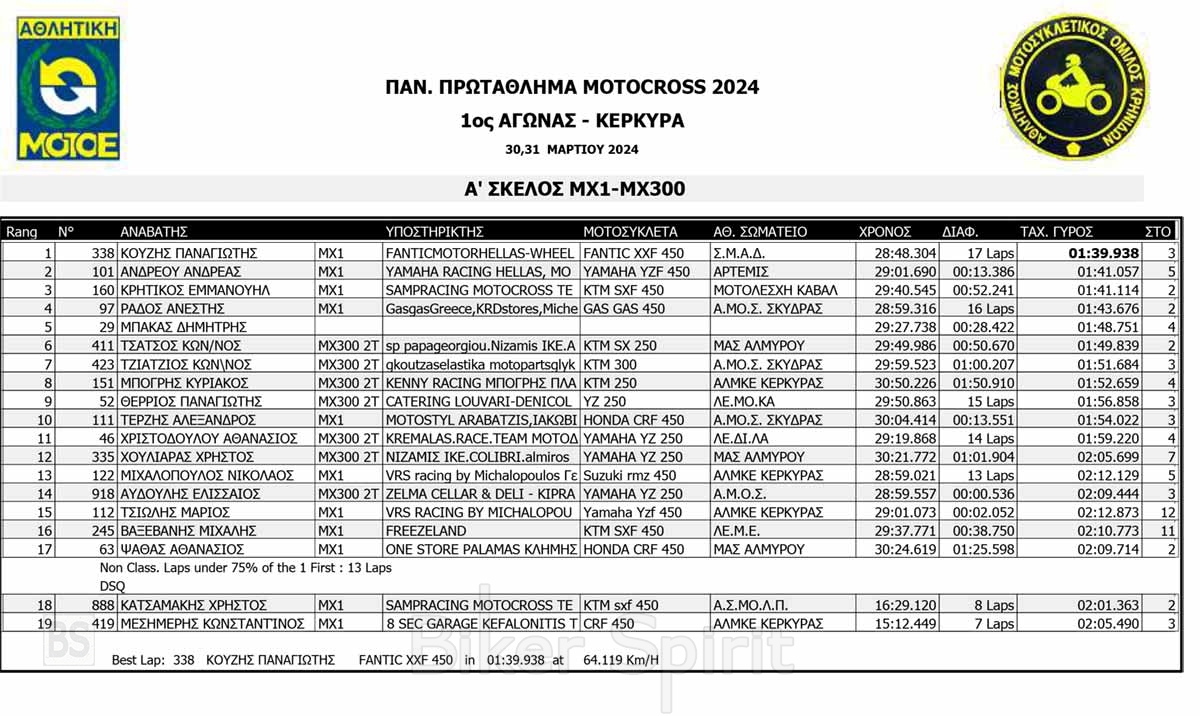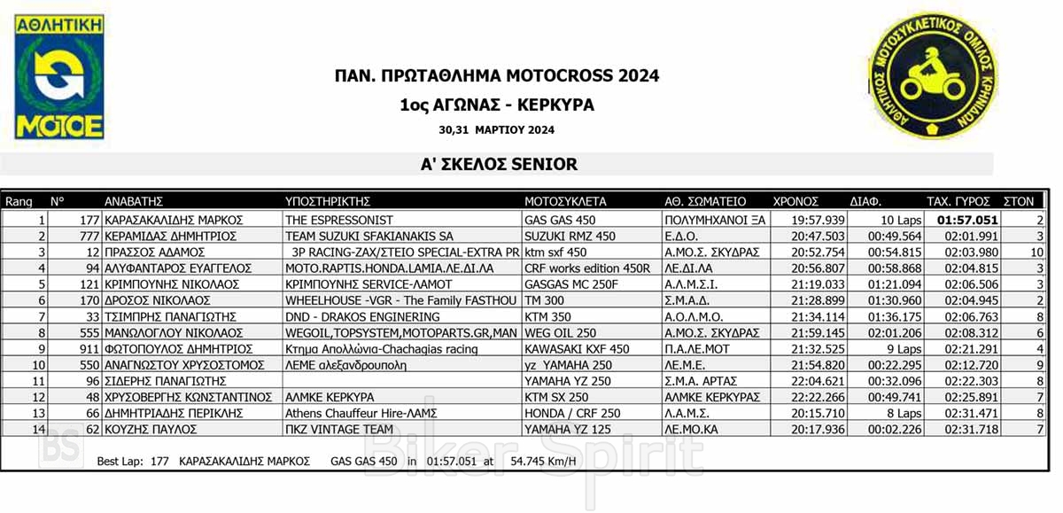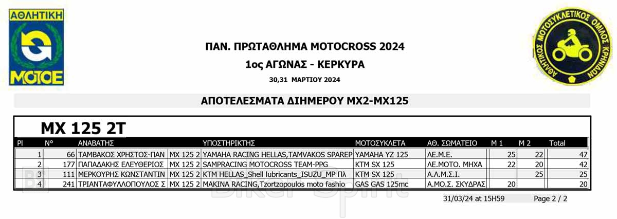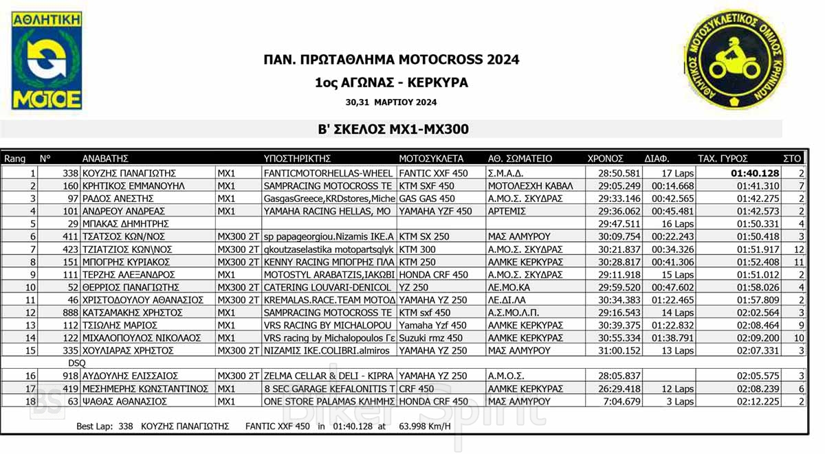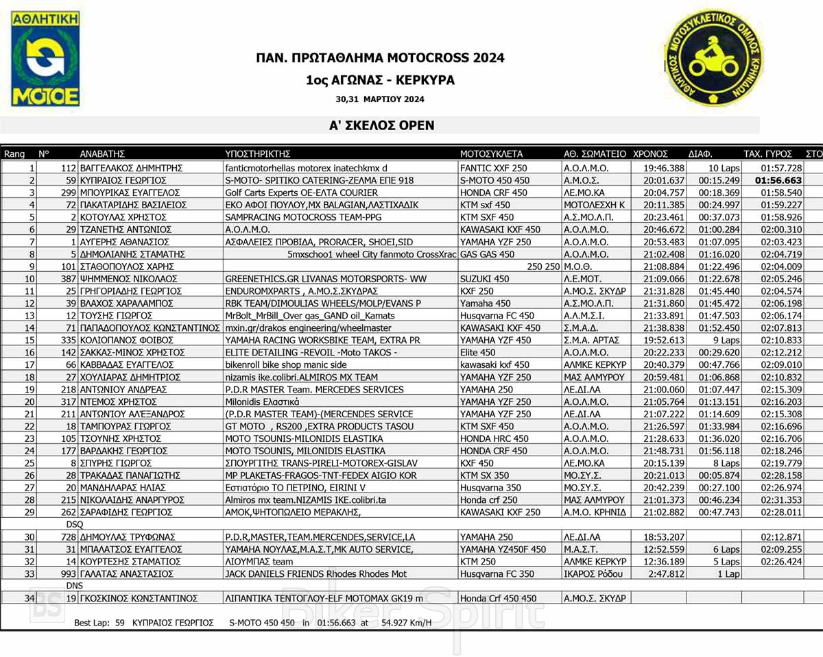 ΑΠΟΤΕΛΕΣΜΑΤΑ του 1ου αγώνα Πανελληνίου Πρωταθλήματος Motocross 2024 στην Κέρκυρα με νικητές Κουζή και Ζούνη