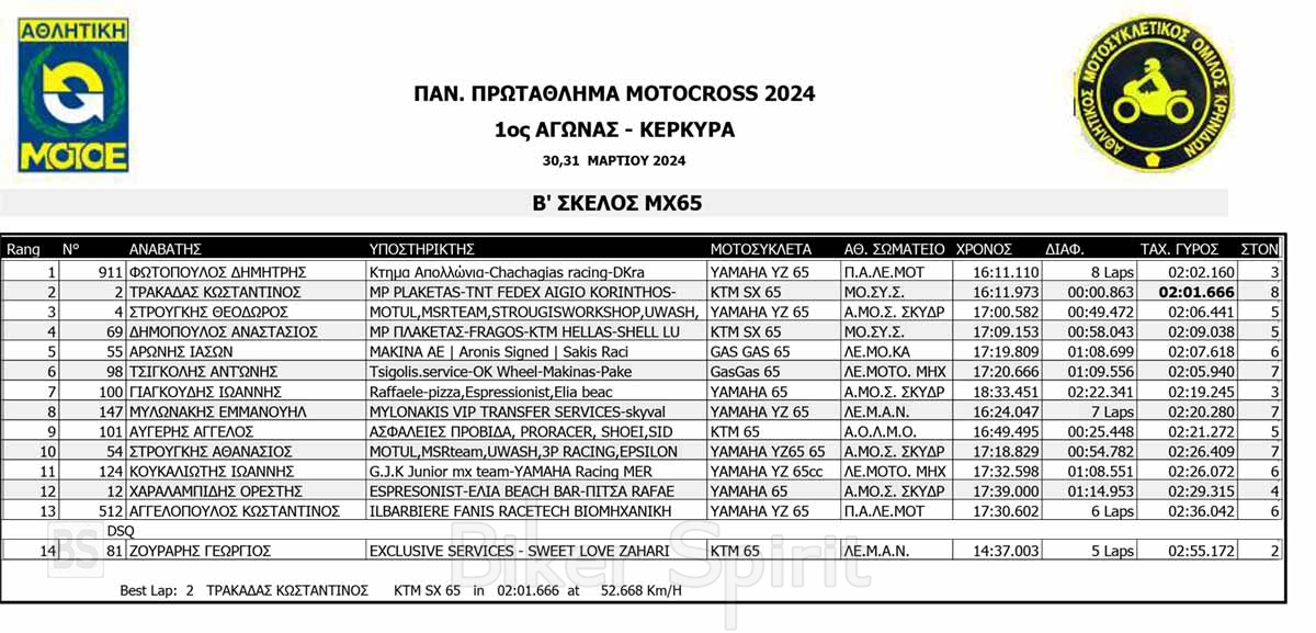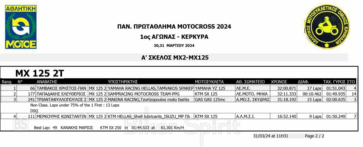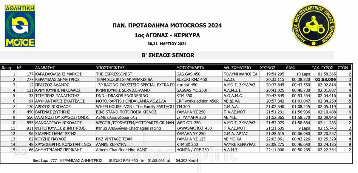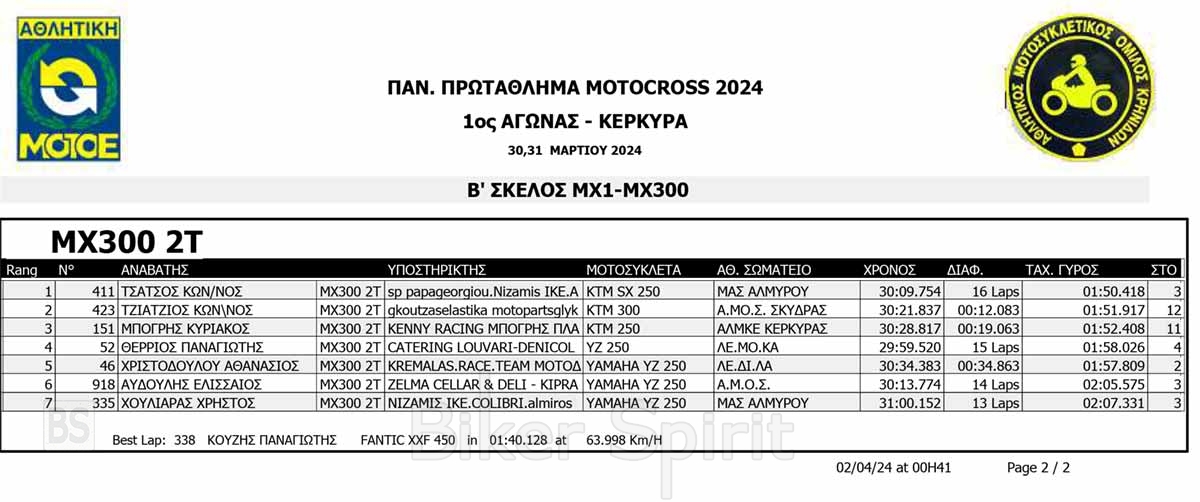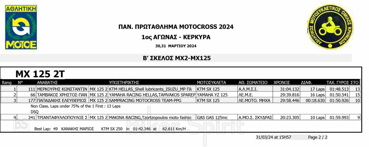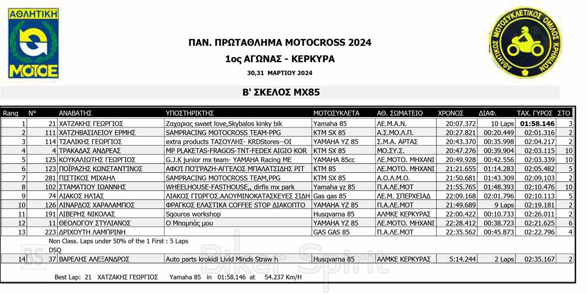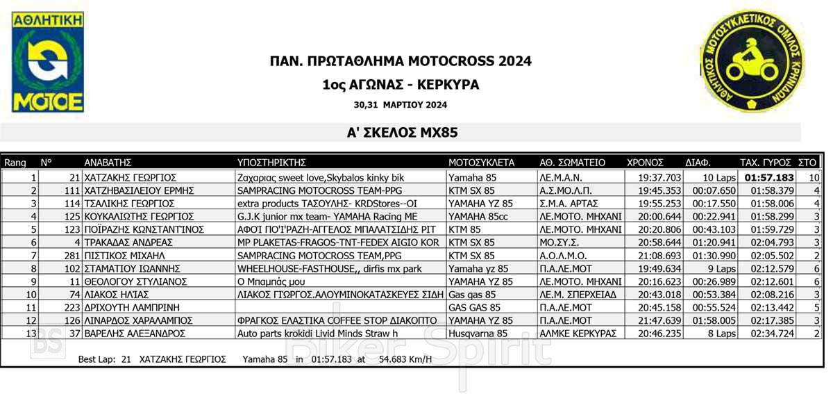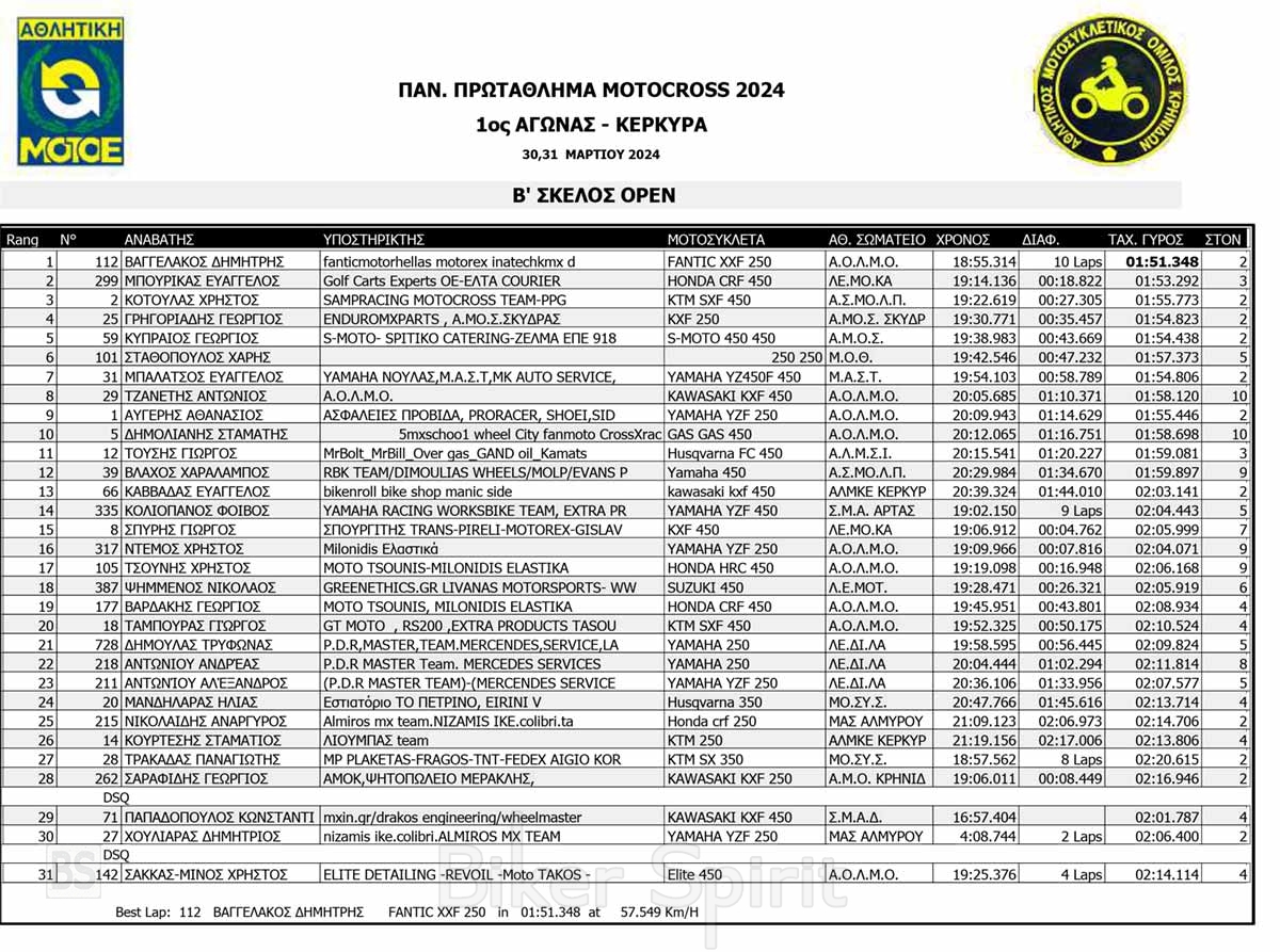 ΑΠΟΤΕΛΕΣΜΑΤΑ του 1ου αγώνα Πανελληνίου Πρωταθλήματος Motocross 2024 στην Κέρκυρα με νικητές Κουζή και Ζούνη