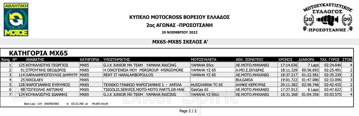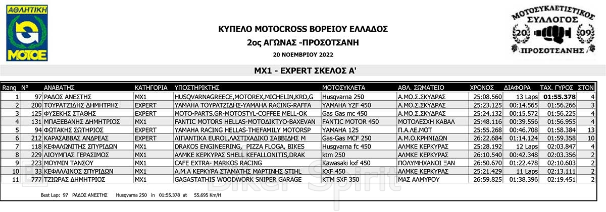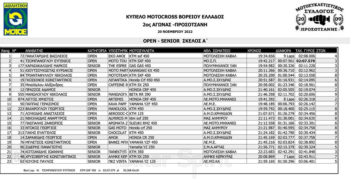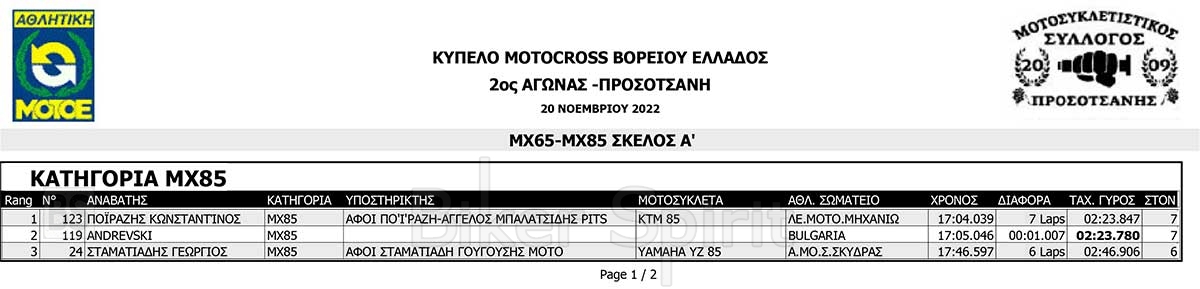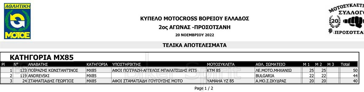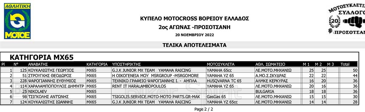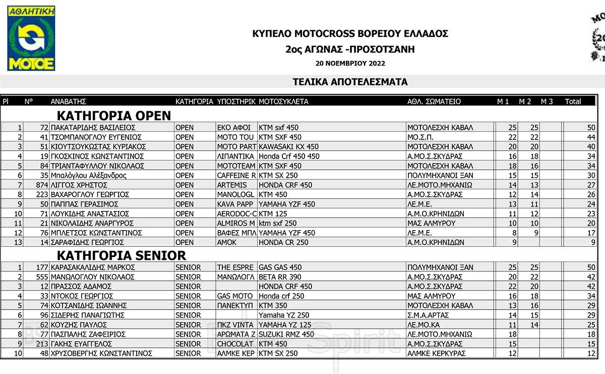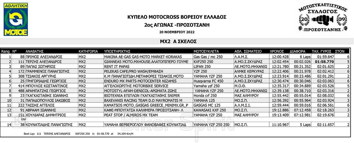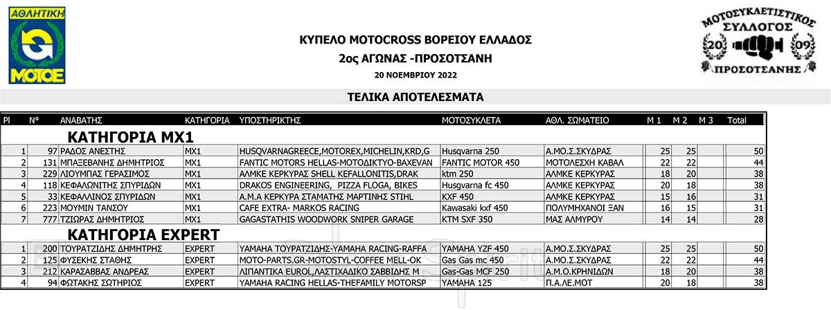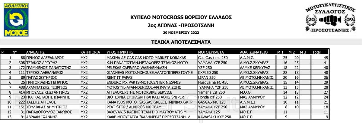 ΑΠΟΤΕΛΕΣΜΑΤΑ του 3ου αγώνα Κυπέλλου Βορείου Ελλάδος Motocross 2022 – Προσοτσάνη – 20/11/2022