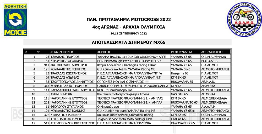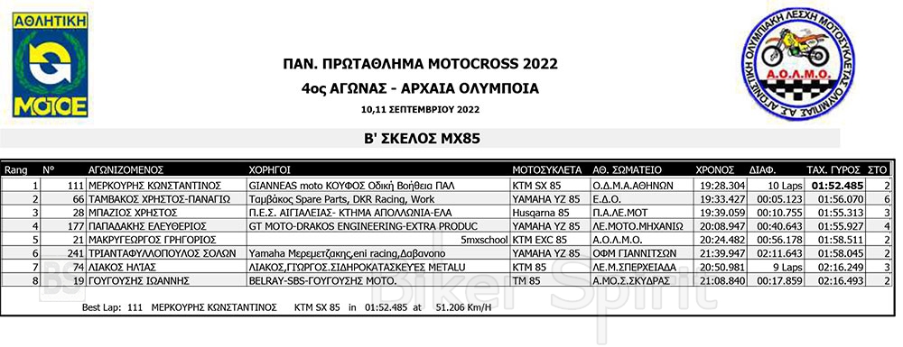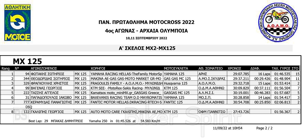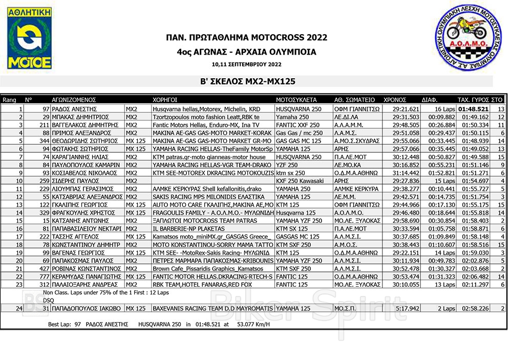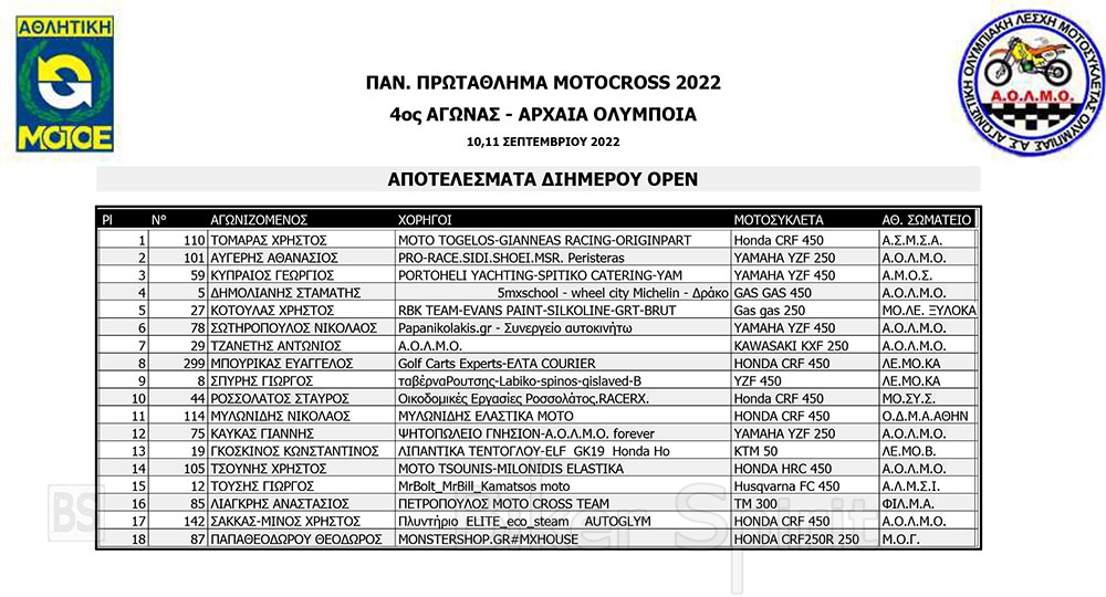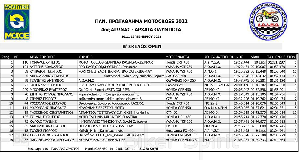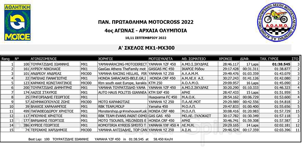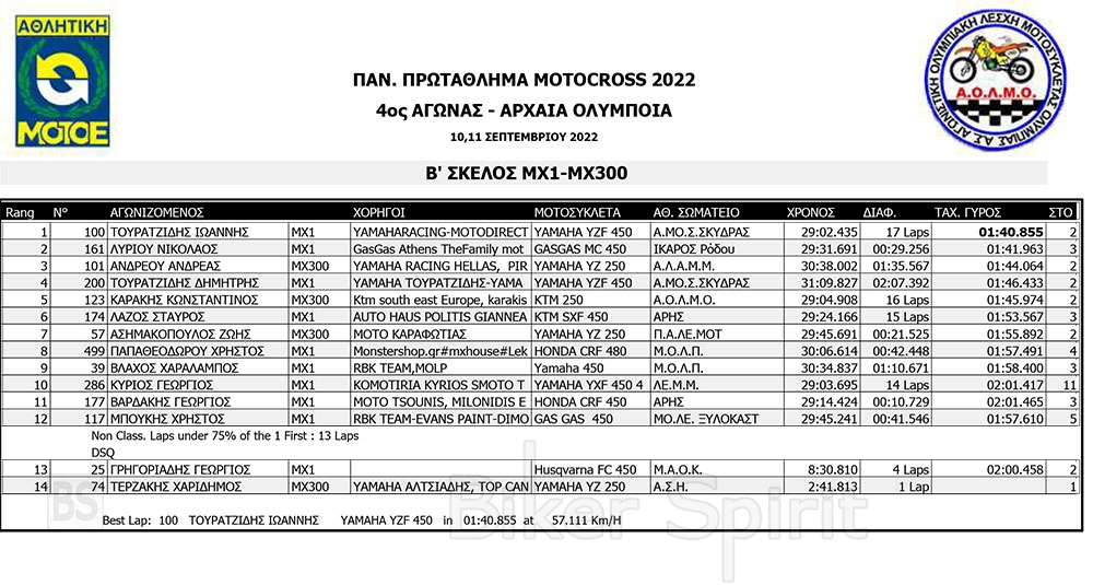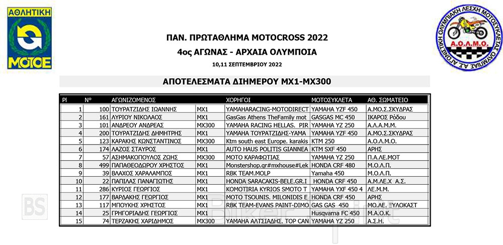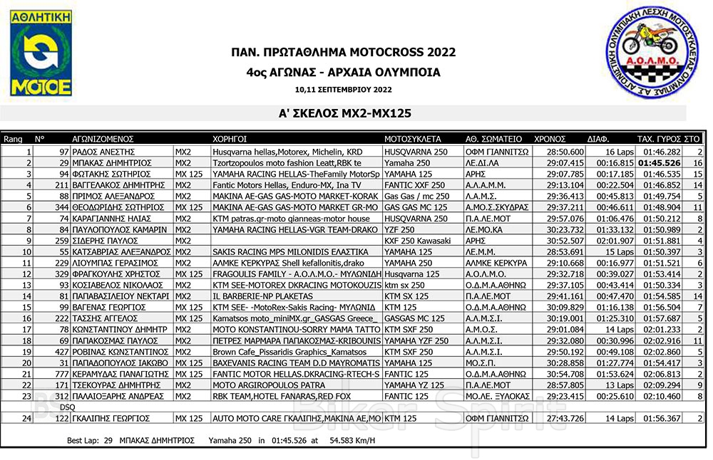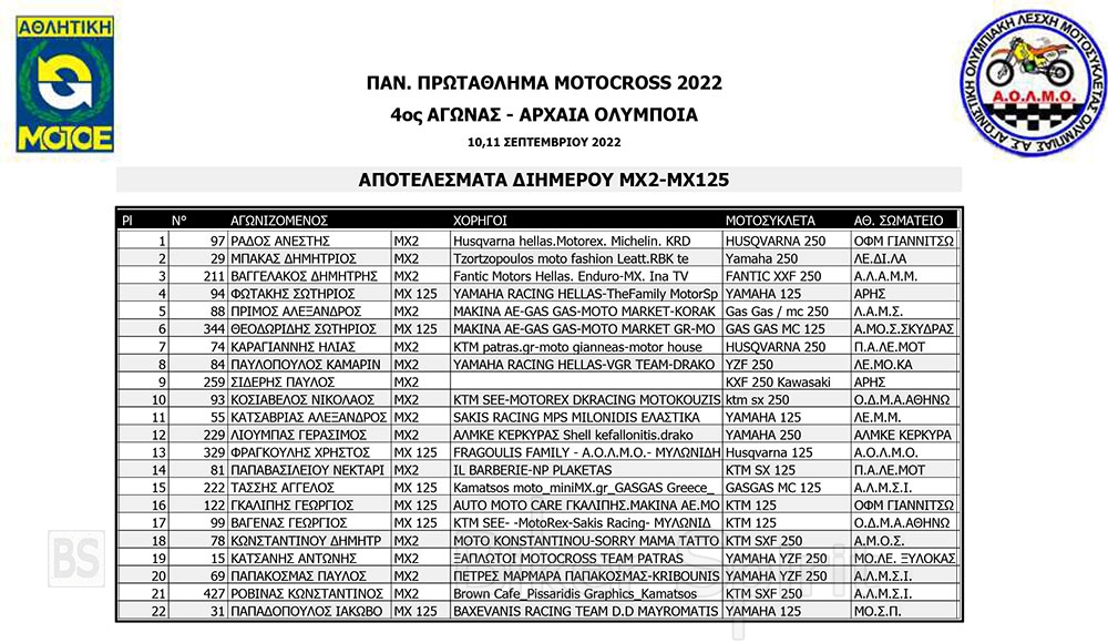 ΑΠΟΤΕΛΕΣΜΑΤΑ του 4ου αγώνα Πανελληνίου Πρωταθλήματος Motocross 2022 – Αρχαία Ολυμπία με νικητές Τουραζίδη και Ράδο