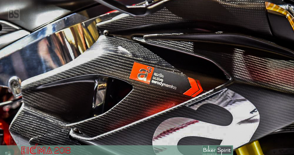 Αλλά αναμφισβήτητα, το πιο συναρπαστικό χαρακτηριστικό της είναι το ενεργό αεροδυναμικό σύστημα. Πιο συγκεκριμένα, το σύστημα Aprilia ενεργή αεροδυναμική (Α3) είναι ένα έξυπνο κομμάτι του κιτ που επιτρέπει στην μοτοσυκλέτα να αλλάξει το εμπρός αεροδυναμικό προφίλ της, καθώς και την κάθετη δύναμη.