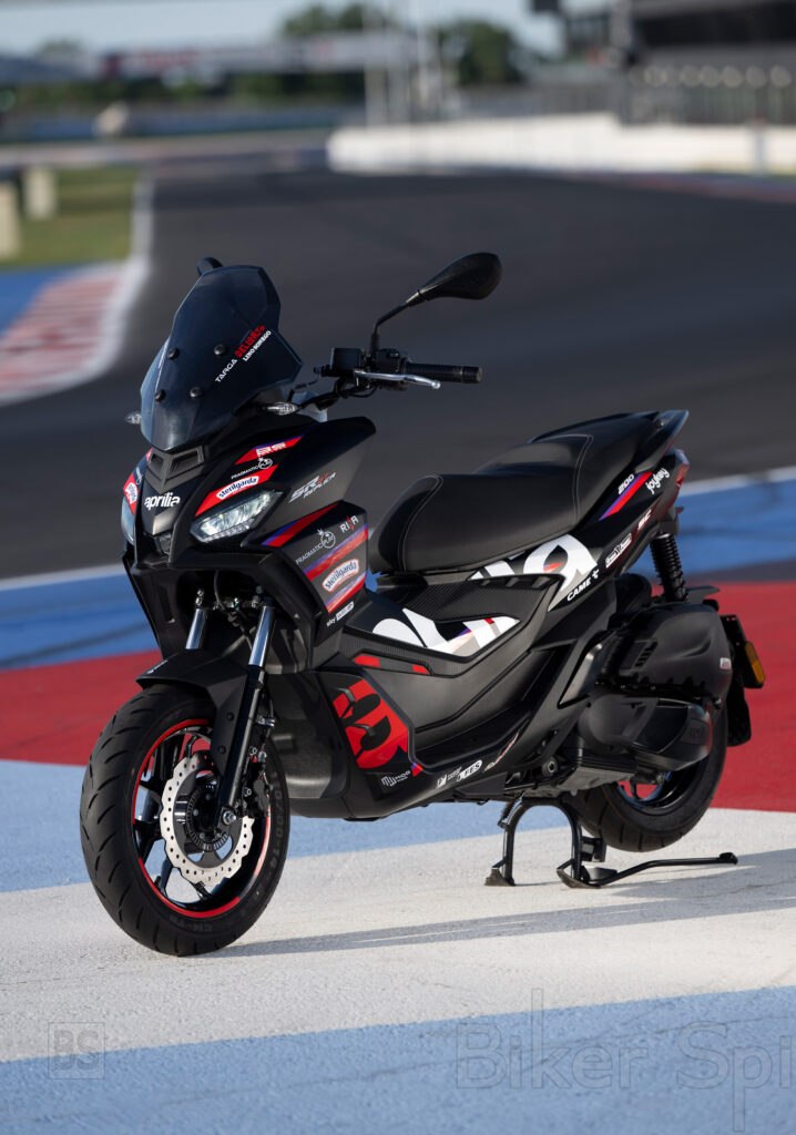 Ακριβώς όπως οι μοτοσυκλέτες MotoGP που δημιουργούνται από το αγωνιστικό τμήμα του Noale, οι ζάντες είναι βαμμένες μαύρες, με κόκκινες λεπτομέρειες που δημιουργούν αντίθεση στο κανάλι του μπροστινού τροχού. Με την πρώτη ματιά, ξεχωρίζουν τα εμπρός και πίσω δισκόφρενα με προφίλ μαργαρίτας. Αντανακλώντας το αγωνιστικό πνεύμα της μοτοσυκλέτας, το πακέτο εξοπλισμού περιλαμβάνει επίσης ελαστικά με σπορ πέλμα δρόμου αντί για τα ελαφρώς τρακτερωτά ελαστικά “all terrain” που χαρακτηρίζουν τις άλλες εκδόσεις, Aprilia SR GT και SR GT Sport.