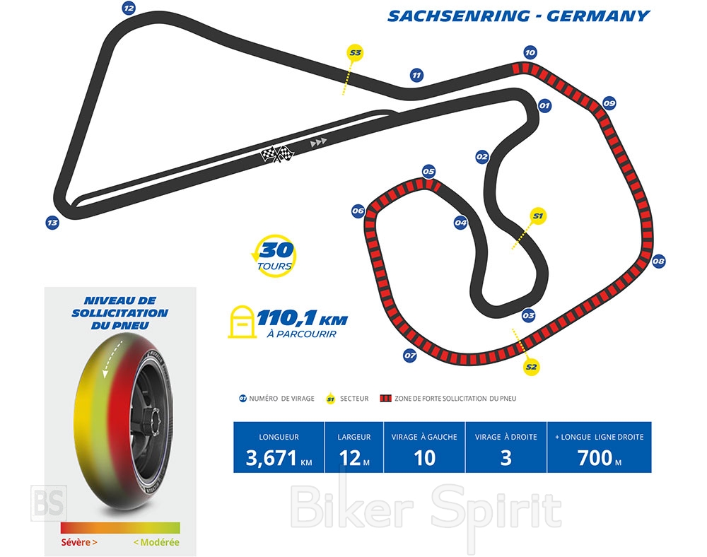 Η πίστα του Sachsenring βρίσκεται κοντά στο Chemnitz, έχει μήκος 3.771 μέτρα και αποτελεί όχι μόνο μια από τις πιο κοντές σε μήκος πίστες του πρωταθλήματος αλλά και μια από τις πιο αργές. Ωστόσο, η φορά της πίστας είναι αριστερόστροφη με αποτέλεσμα οι 10 αριστερές στροφές σε συνδυασμό με τις 3 δεξιές και την ευθεία των μόλις 700μ. Να ασκούν μεγάλη πίεση στην αριστερή πλευρά του ελαστικού. Λόγω αυτής της διάταξης, τα ελαστικά περνούν μεγαλύτερο χρονικό διάστημα πλαγιασμένα στην αριστερή πλευρά τους παρά στην όρθια θέση τους κι αν σκεφτεί κανείς ότι αυτό επαναλαμβάνεται για 30 γύρους, τότε αντιλαμβάνεται ότι τα MICHELIN Power Slicks ελαστικά έχουν μια εξειδικευμένη αποστολή στο συγκεκριμένο αγώνα. Λόγω των πολυάριθμων σφιχτών στροφών της, η συγκεκριμένη πίστα αποτελεί μια πρόκληση για τους μηχανικούς των ομάδων, με μια θεαματική κατηφορική δεξιά τον καταράκτη που απαιτεί απο τους αναβάτες ακόμα περισσότερη συγκέντρωση.