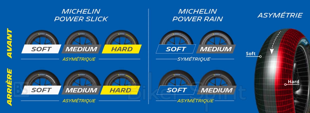 Έχοντας υπόψη αυτές τις απαιτήσεις, ολόκληρη η γκάμα θα είναι ασύμμετρη, με όλα τα εμπρός και πίσω ελαστικά να φέρουν σκληρότερο μείγμα γόμας στην αριστερή πλευρά του πέλματος σε αντίθεση με τη δεξιά που θα είναι πιο μαλακό για να μπορεί να έρχεται άμεσα στη θερμοκρασία λειτουργίας, όταν ο αναβάτης θα αναζητάει καλή πρόσφυση σε οποιαδήποτε από τις τρεις δεξιές στροφές της πίστας.