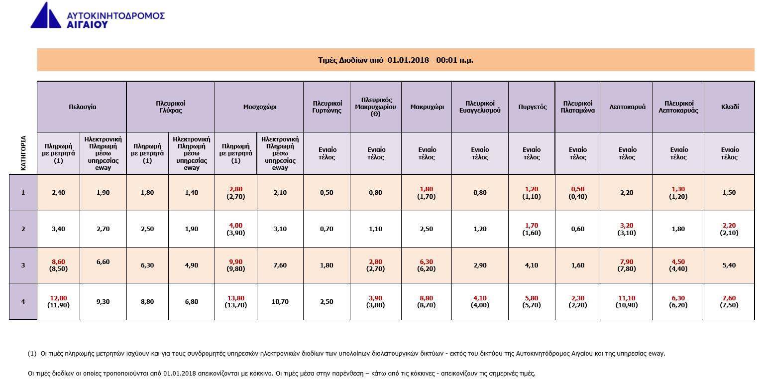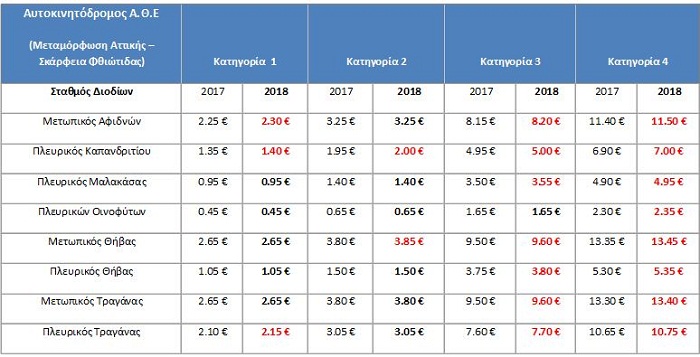 Στους παρακάτω πίνακες παρουσιάζονται αναλυτικά οι νέες τιμές ανά αυτοκινητόδρομο και σταθμό διοδίων. Με κόκκινο χρώμα εμφανίζονται τα διόδια όπου θα γίνει η αύξηση ενώ με μαύρο χρώμα παρουσιάζονται οι σταθμοί όπου οι τιμές παραμένουν αμετάβλητες σε σχέση με πέρυσι.