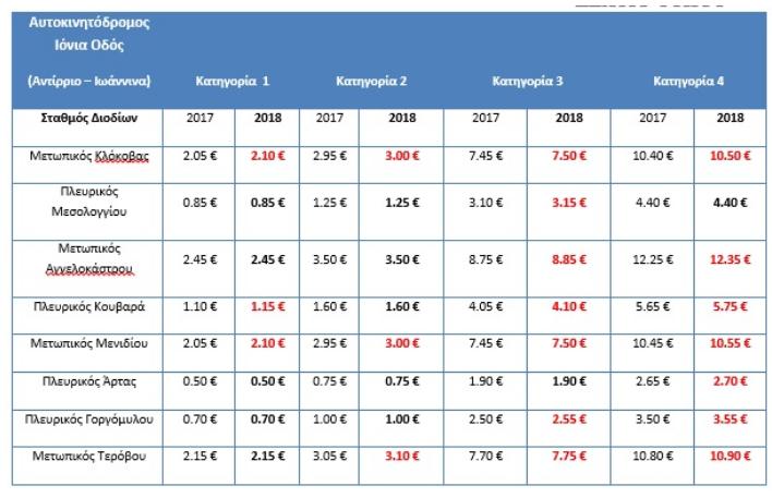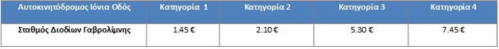 Εκτός από τις αυξήσεις σε λειτουργία μπαίνει από τα μεσάνυχτα της ερχόμενης Τρίτης, 9 Ιανουαρίου, ο πλευρικός σταθμός Γαβρολίμνης, στην Ιόνια Οδό, με τον οποίο και ολοκληρώνεται το σύστημα χρέωσης του αυτοκινητοδρόμου. Τα διόδια τέλη ανά κατηγορία οχήματος θα είναι τα εξής: