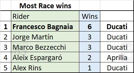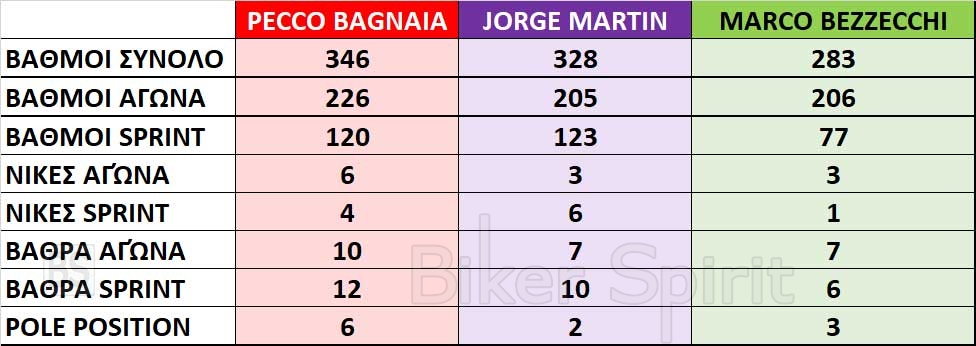 Στους αγώνες της Κυριακής ο Pecco Bagnaia έχει 6 νίκες στους 15 αγώνες, ενώ ο Martin έχει μόλις 3, όπως και ο Bezzecchi.