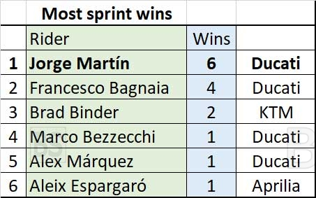 Aν υπήρχαν μόνο αγώνες Sprint o Martin θα ήταν πρώτος με 123 βαθμούς, με 3 βαθμούς διαφορά από τον Bagnaia, αφού στους αγώνες Sprint του Σαββάτου ο Martin έχει 6 νίκες, έναντι των 4 του Bagnaia.