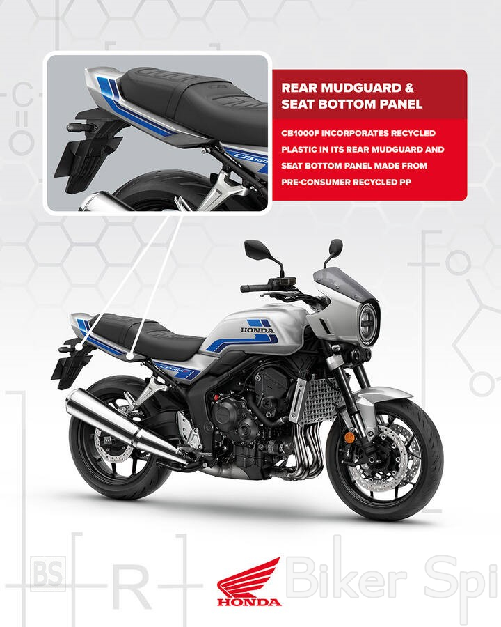 Για παράδειγμα, στα SH125i και SH150i Vetro έχουν εφαρμοστεί ημιδιάφανα, άβαφα πλαστικά fairing panels — των οποίων η παραγωγή εκπέμπει 9,5% λιγότερο CO2 ετησίως στο εργοστάσιο της Atessa σε σχέση με τις διαδικασίες βαφής[3]. Επιπλέον, έξι μοτοσυκλέτες της Honda στην Ευρώπη διαθέτουν πλέον ανακυκλωμένα πλαστικά και DURABIO™, ένα βιο-βασισμένο τεχνικό πλαστικό που έχει αναπτυχθεί από τον Όμιλο Mitsubishi Chemical (MCG Group). Ήδη χρησιμοποιείται σε διάφορα μοντέλα, με ακόμη περισσότερα να ακολουθούν.