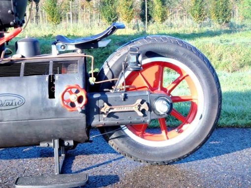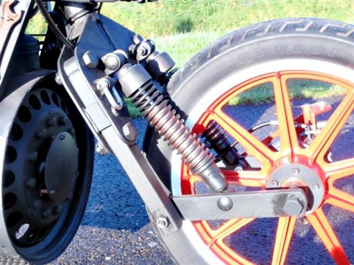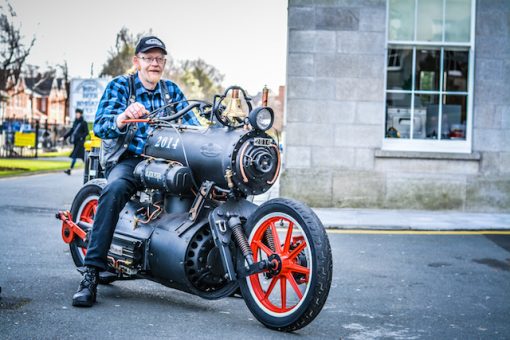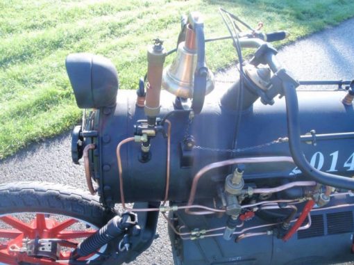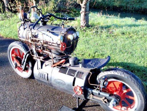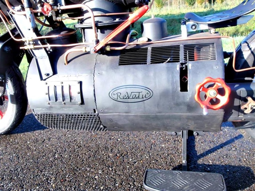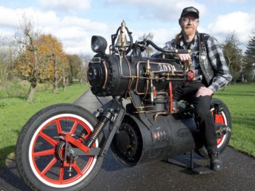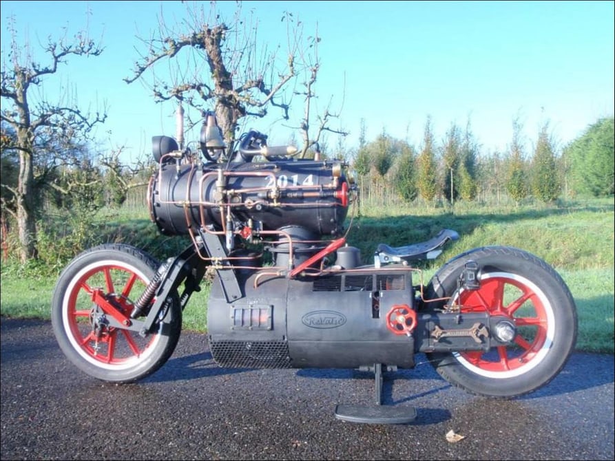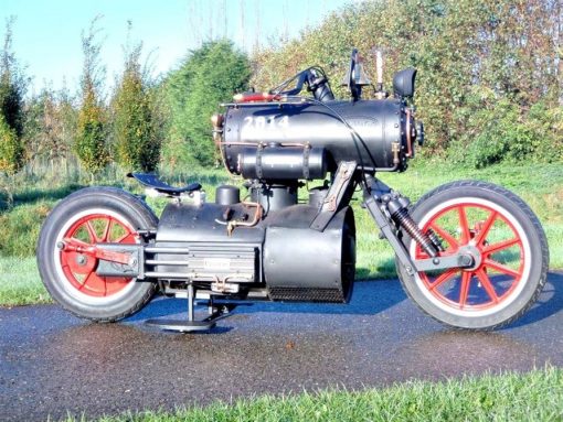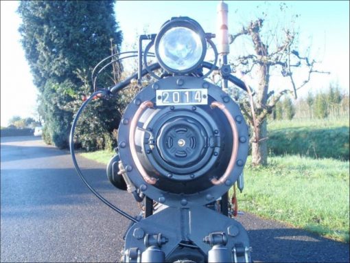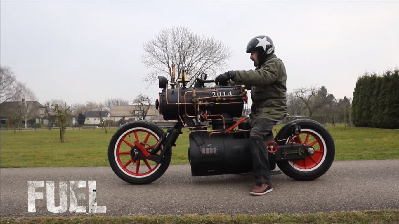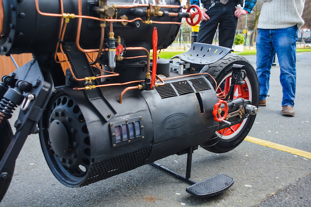 Η μοναδική αυτή μοτοσυκλέτα τροφοδοτείται από μια λειτουργική ατμομηχανή, με τον πίσω τροχό να παίρνει κίνηση από ένα μεγάλο στροφαλοφόρο άξονα.