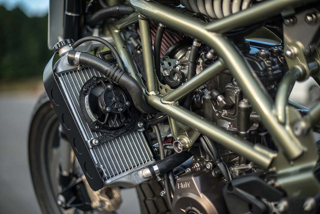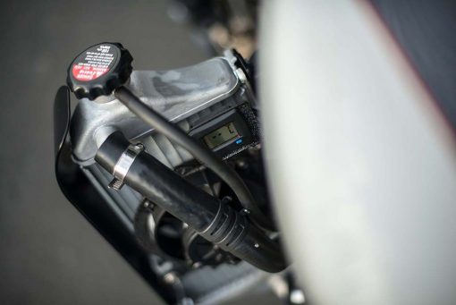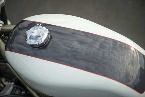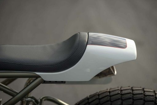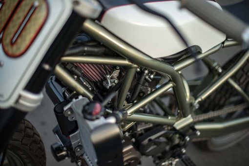 Το φίλτρο αέρα είναι αλλαγμένο όπως και η μπαταριά, για να βρεθεί χώρος να μπει το αμορτισέρ κάτω από το ντεπόζιτο, το οποίο και αυτό είναι χειροποίητο, όπως τα περισσότερα εξάρτημα που βλέπουμε πάνω στην μηχανή!