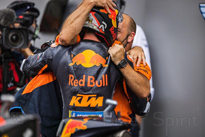 Ο οδηγός της ομάδας Red Bull KTM, βρέθηκε στην κορυφή του αγώνα τέσσερεις γύρους πριν το τέλος όταν ξεκίνησε δυνατή βροχή και ο επικεφαλής του αγώνα εκείνη την ώρα Marquez, μαζί με τον Bagnaia, Martin, Quartararo και Mir, μπήκαν να αλλάξουν μοτοσυκλέτα με βρόχινα ελαστικά!