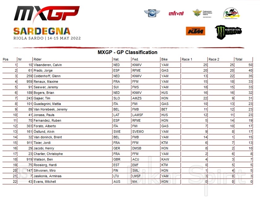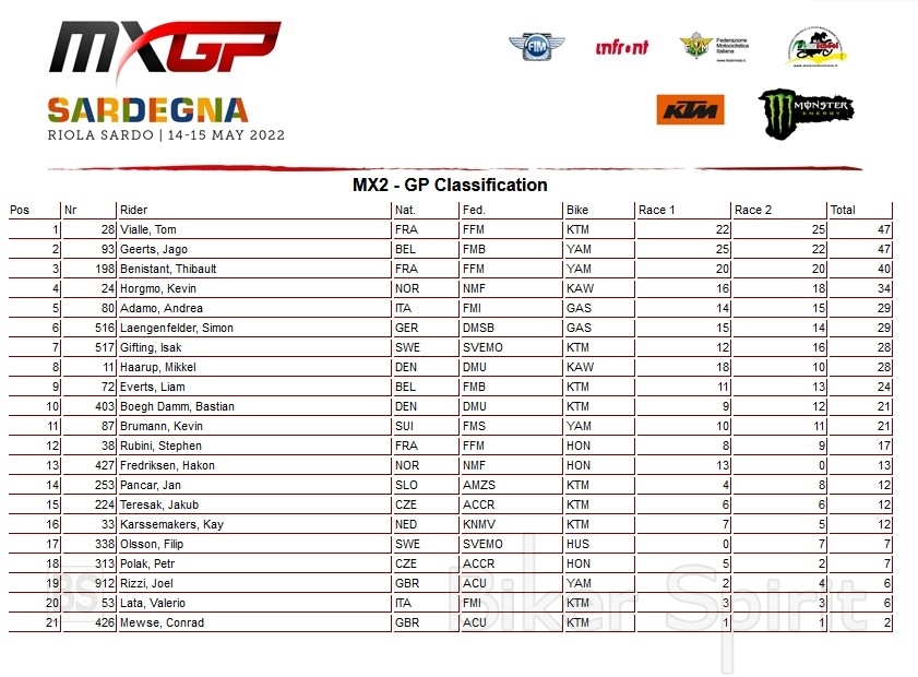 Για τον Calvin Vlaanderen ήταν ένα αξέχαστο Σαββατοκύριακο, καθώς ήταν στην κορυφή των chart σε κάθε συνεδρία κατά τη διάρκεια του Σαββατοκύριακου, κέρδισε τον προκριματικό αγώνα και τις δύο προκρίσεις για να εξασφαλίσει την πρώτη του συνολική νίκη στην κατηγορία MXGP. Εν τω μεταξύ , ο Tom Vialle πανηγύρισε επίσης καθώς εξασφάλισε την πρώτη του νίκη στο GP μετά το Trentino και τη δεύτερη εδώ στο Riola Sardo.