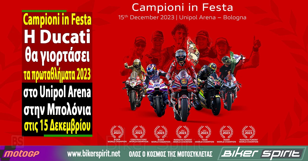 Μετά την ολοκλήρωση της αγωνιστικής σεζόν 2023, η Ducati ετοιμάζεται να γιορτάσει τις νίκες που επιτεύχθηκαν στα παγκόσμια πρωταθλήματα MotoGP, WorldSBK και WorldSSP, προσκαλώντας όλους τους λάτρεις να παρακολουθήσουν το Campioni in Festa.
