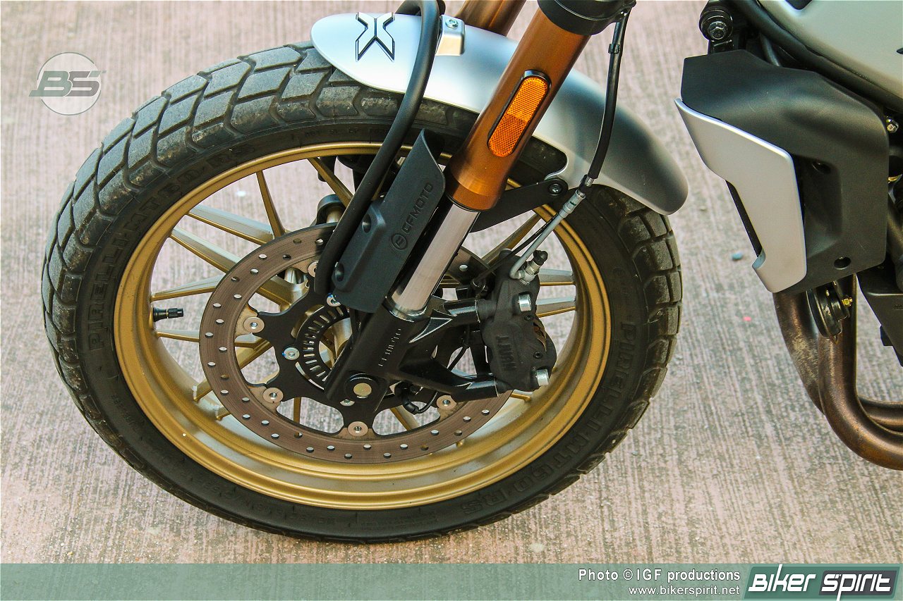 Η CFMoto αναφέρει πως η χρήση ενός δίσκου εμπρός αντί για δύο είναι συνειδητή επιλογή κατόπιν εκτεταμένων δοκιμών, και ισχυρίζεται ότι εξασφαλίζει καλύτερη οδική συμπεριφορά και ευελιξία. Εμάς πάντως δεν μας έλειψε η σταθερότητα και η αποτελεσματικότητα στο φρενάρισμα!