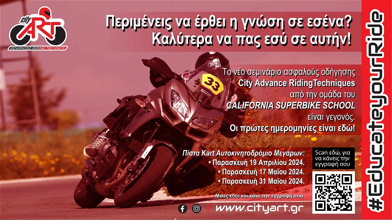 Μετά από 11 χρόνια δραστηριότητας σε Ελλάδα και εξωτερικό, το City΄s ART είναι έτοιμο να ξεκινήσει τα εξειδικευμένα μαθήματά του και να συνεχίσει να διδάσκει τους μοτοσυκλετιστές σωστή και ασφαλή οδήγηση μοτοσυκλέτας! Η αρχή για το 2024 θα γίνει την Παρασκευή 19 Απριλίου στην πίστα Kart του αυτοκινητοδρομίου των Μεγάρων και τα σεμινάρια θα συνεχιστούν στην ίδια τοποθεσία την Παρασκευή 17 Μαϊου και την Παρασκευή 31 Μαϊου.