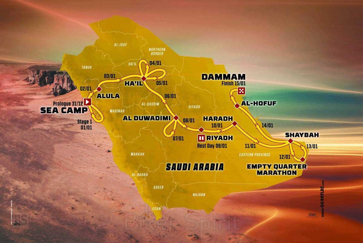 Ξεκινώντας από το Sea Camp στις όχθες της Ερυθράς Θάλασσας και τελειώνοντας στην απέναντι πλευρά της Αραβικής Χερσονήσου, όπου οι αγωνιζόμενοι θα ανακαλύψουν την ακτή του Περσικού Κόλπου μετά από μια τετραήμερη περιπέτεια στο Empty Quarter, συμπεριλαμβανομένης της σκηνής του μαραθωνίου, η 45η έκδοση του Ντακάρ είναι η πιο σκληρή από τότε που ήρθε το ράλι στη Σαουδική Αραβία. Με πάνω από 8.000 χιλιόμετρα και σχεδόν 5.000 χιλιόμετρα ειδικών, με έναν πρόλογο και 14 στάδια, η διαδρομή είναι μια πραγματική δοκιμασία εξαιρετικής αντοχής.