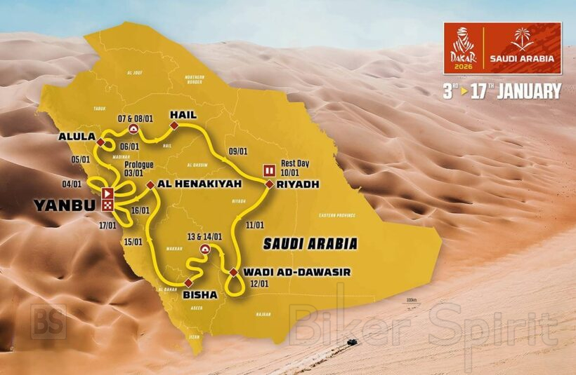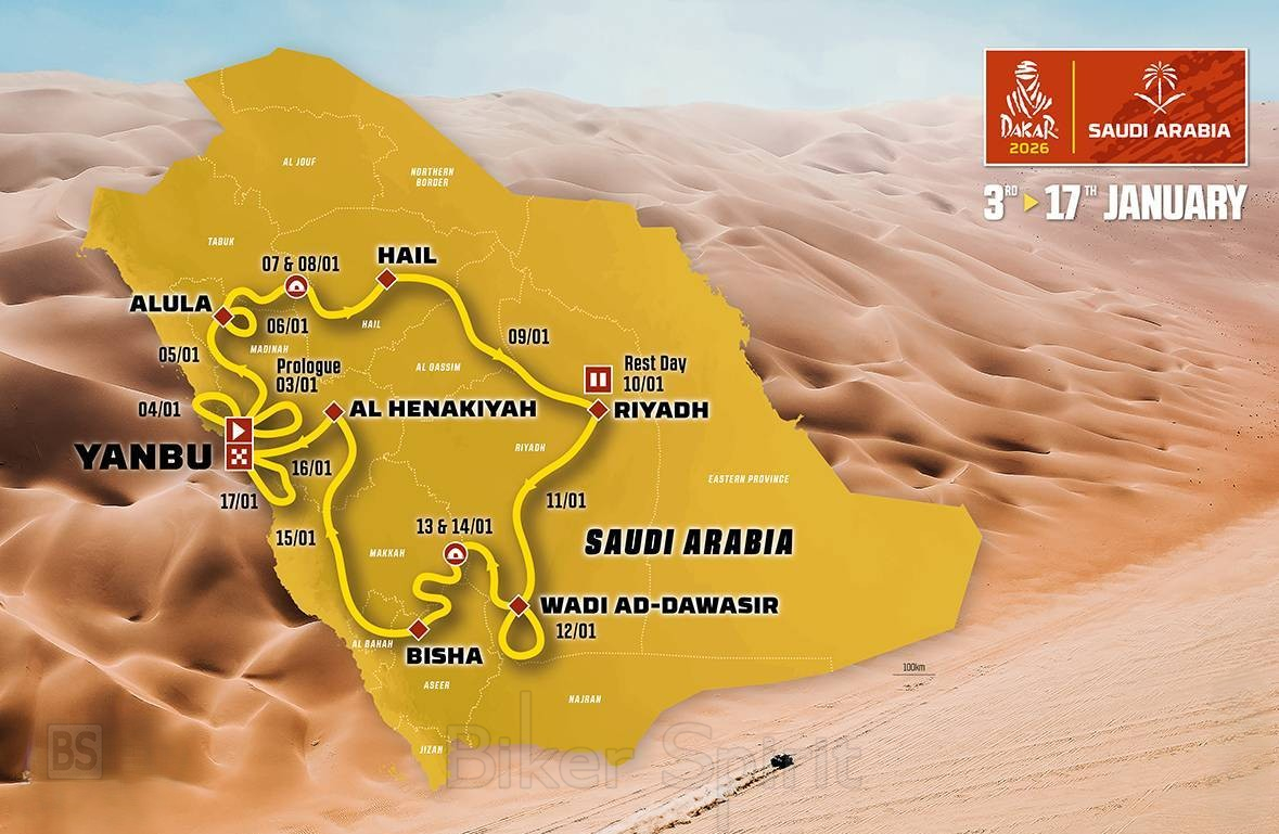 Η εκκίνηση και ο τερματισμός του Dakar 2026 θα πραγματοποιηθούν στο Yanbu, στις ακτές της Ερυθράς Θάλασσας. Από εκεί, οι αναβάτες της κατηγορίας μοτοσυκλέτας θα κληθούν να καλύψουν συνολικά 7.937 χιλιόμετρα, εκ των οποίων: