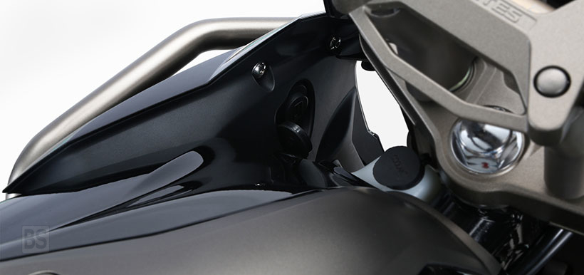Η ρυθμιζόμενη ζελατίνα προστατεύει τον αναβάτη από τον αέρα, ενώ πίσω της υπάρχει η μεγάλη ψηφιακή οθόνη-πολυόργανο και το ψηλό τιμόνι με προστατευτικές χούφτες, με αντίβαρα στα άκρα του και ρυθμιζόμενες μανέτες. Πίσω από το τιμόνι, βρίσκεται ένα χρηστικό ντουλαπάκι που ανοίγει με push button για ψιλά ή το “κλειδί”-πομπό. Στο εσωτερικό της μάσκας υπάρχει μία κρυφή θύρα φόρτισης USB.