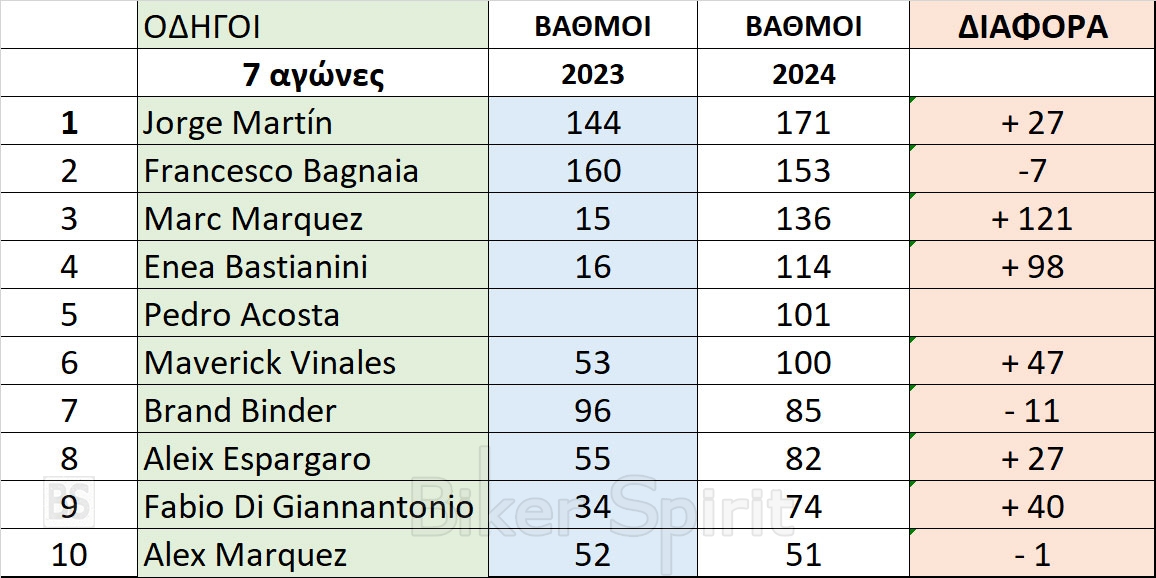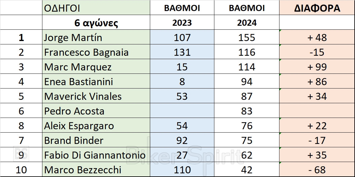 Ορισμένοι αναβάτες έχουν πολύ περισσότερους βαθμούς από το 2023, άλλοι έχουν μια καθοδική πορεία φέτος σε σχέση με το 2023!