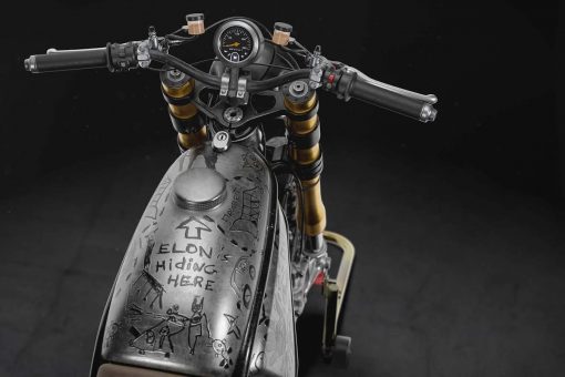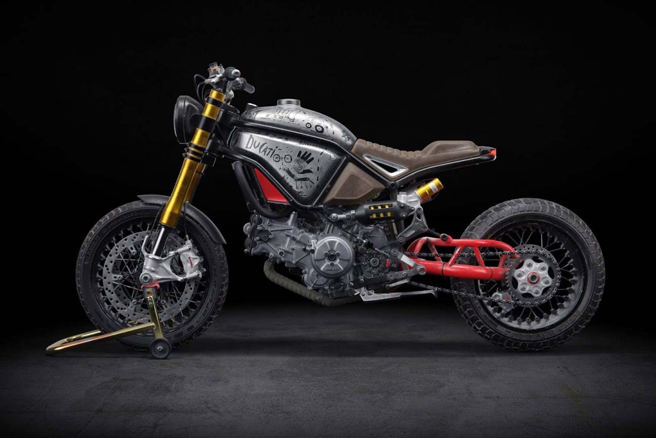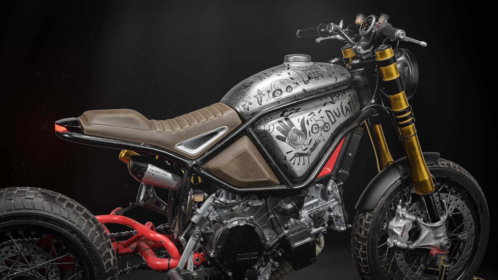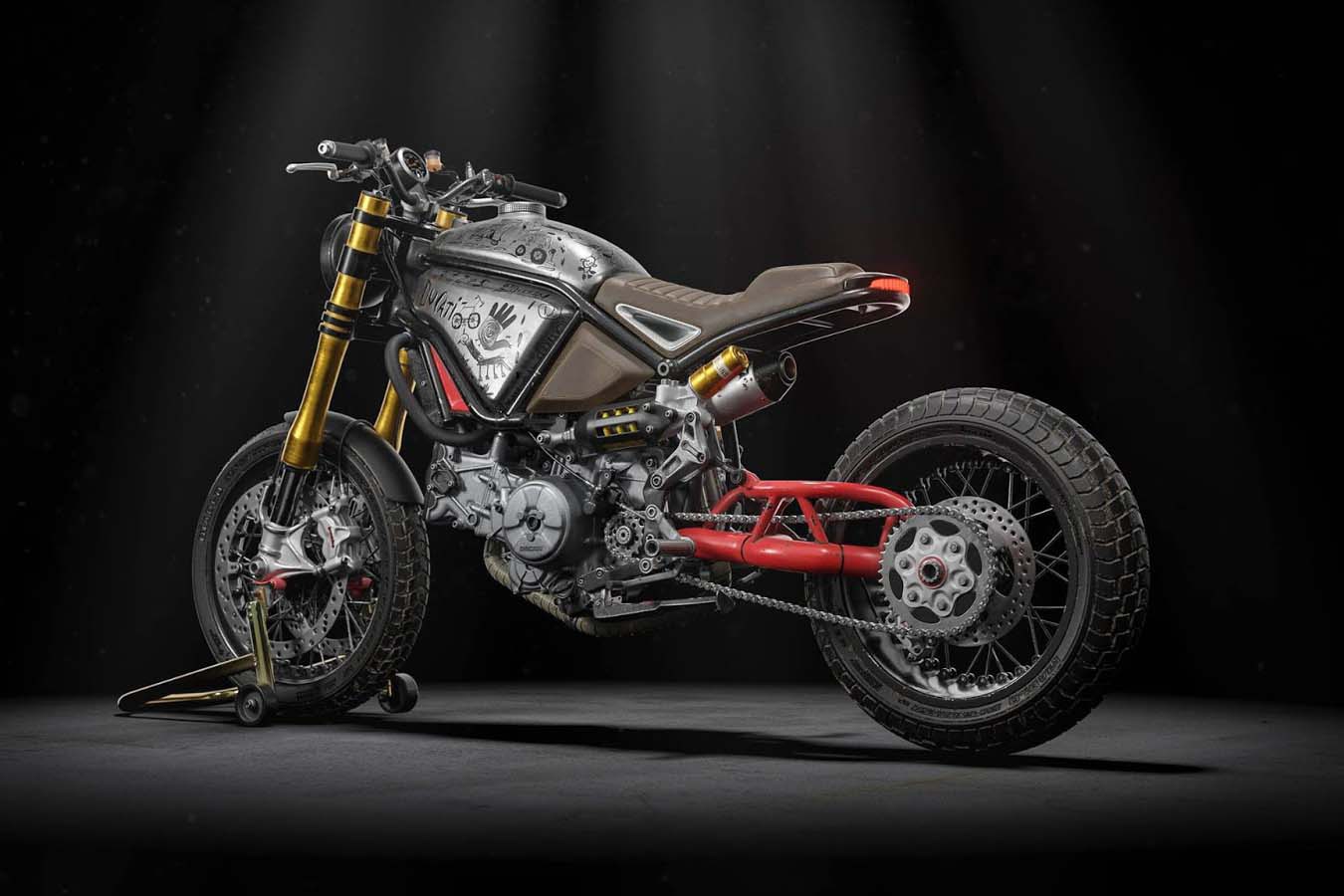 Για να δημιουργήσει το Naughty Quadro, ο Afanasyev πήρε τον κινητήρα του Panigale, Superquadro, και “έχτισε” γύρω του ένα ελκυστικό και μοντέρνο σώματος, θυμίζει πολύ το Scrambler. Το ψαλίδι του είναι απο Ducati Monster S2R 1000.