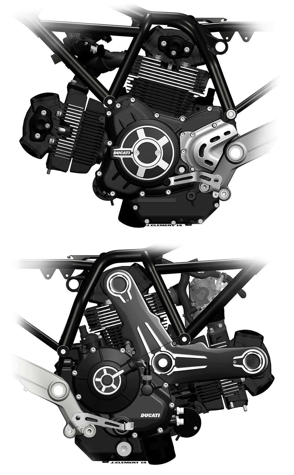 | Κινητήρας | Ducati, τετράχρονος, αερόψυκτος, δικύλινδρος V 90°, με 1 επικεφαλή εκκεντροφόρο ανά μπλοκ, 2 βαλβίδες ανά κύλινδρο και δεσμοδρομικό σύστημα κίνησης των βαλβίδων |