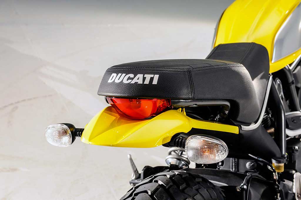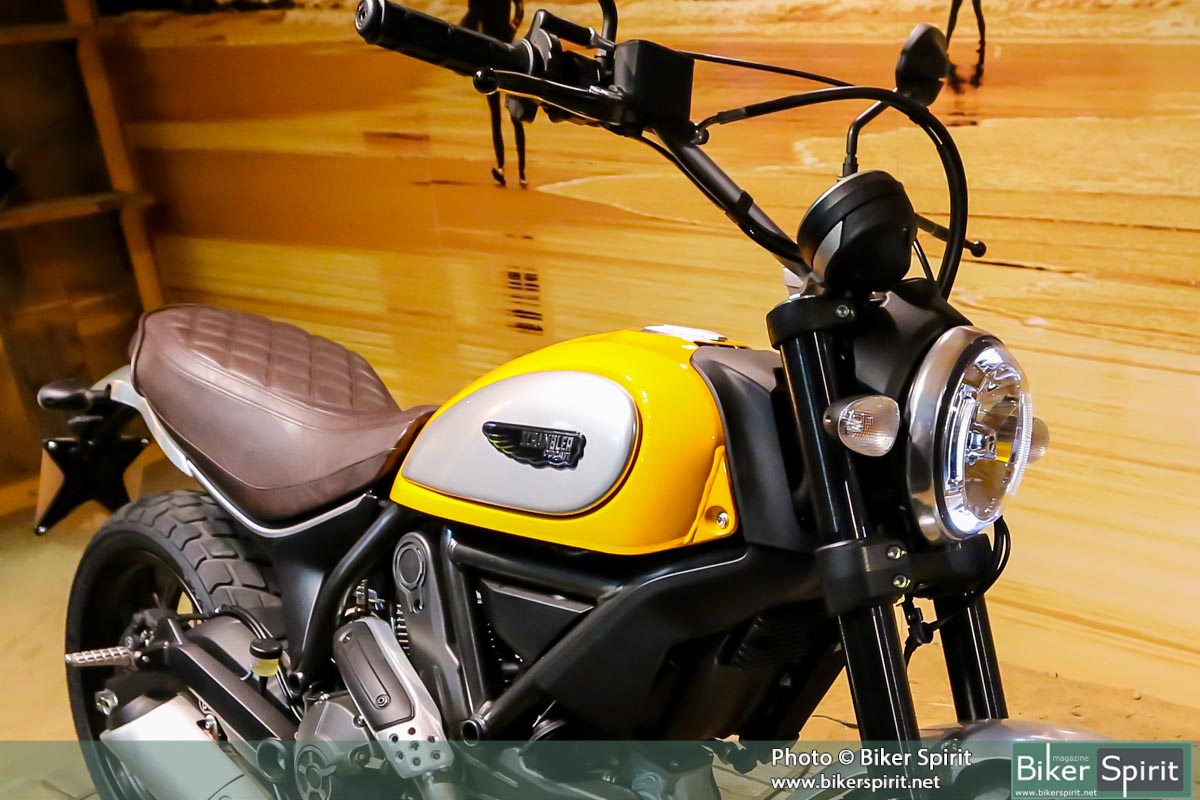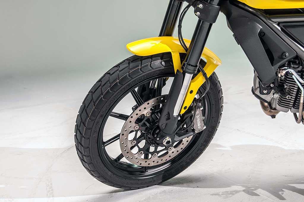 Το Scrambler Icon βγαίνει σε κίτρινο με μαύρο πλαίσιο και μαύρη σέλα και το κόκκινο της Ducati με μαύρο πλαίσιο και μαύρη σέλα. Έχει ατσάλινο Ρεζερβουάρ σε σχήμα δάκρυ με εναλλασσόμενα αλουμινένια πάνελ. Έχει Χαμηλή σέλα στα790 mm. Το βάρος της είναι 170 kg στεγνό. Φοράει φαρδύ τιμόνι και άνετη θέση οδήγησης. 10μπρατσες χυτές ζάντες 18ιντσών εμπρός, 17ιντσών πίσω, ενώ φορά ελαστικά enduro Pirelli, ειδικά βελτιωμένα για το Scrambler. Έχει ABS στο βασικό εξοπλισμό και τέλος έχει χώρο κάτω από τη σέλα με θύρα USB!