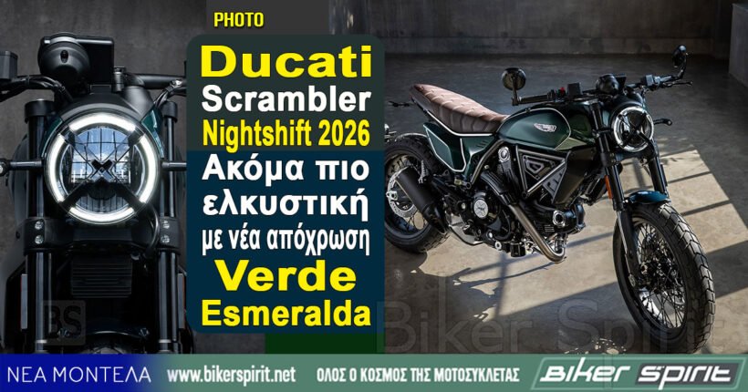 Η Ducati παρουσιάζει για το 2026 τη νέα Scrambler Nightshift, η οποία αποκτά ακόμη πιο ξεχωριστή ταυτότητα χάρη στη νέα απόχρωση Verde Esmeralda, εμπνευσμένη από τα εμβληματικά ’70s. Το νέο χρώμα, σχεδιασμένο από το Centro Stile Ducati, έρχεται να τονίσει την κομψότητα και τον κλασικό χαρακτήρα του μοντέλου.