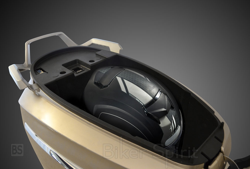 O αποθηκευτικός χώρος κάτω από τη σέλα μπορεί να φιλοξενήσει ένα full face κράνος μαζί με μικροαντικείμενα, ενώ το επίπεδο πάτωμα με μήκος 300mm και πλάτος 400mm δίνει τη δυνατότητα για μεταφορά πραγμάτων με μεγάλο όγκο, αλλά και μεγάλη άνεση στον αναβάτη. Αντίστοιχη φροντίδα έχει μελετηθεί και για το συνεπιβάτη, στον οποίο αναλογεί ένα μεγάλο και ευρύχωρο κομμάτι της σέλας, με τα κομψά αναδιπλούμενα μαρσπιέ και τις μεγάλες χειρολαβές να του προσφέρουν άνεση και εξαιρετική στήριξη.