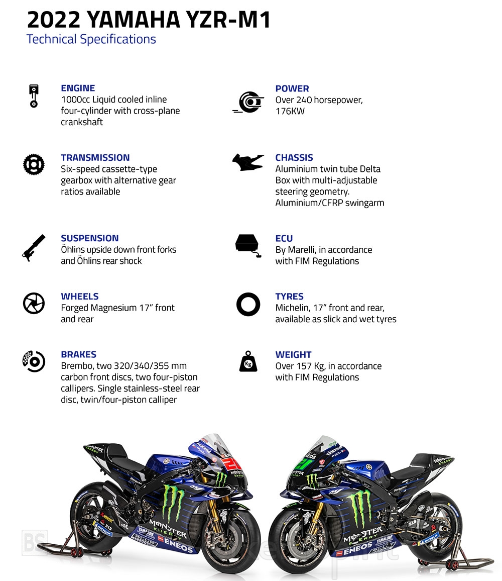 Το χρωματικό σχέδιο της ομάδας Monster Energy Yamaha MotoGP παραμένει το ίδιο για το 2022, τα συνηθισμένα χρώματα «μαύρο-μπλε» των μοτοσυκλετών YZR-M1, το pit box και οι φόρμες των αναβατών με το «Monster Energy black και το Yamaha Factory Racing blue».