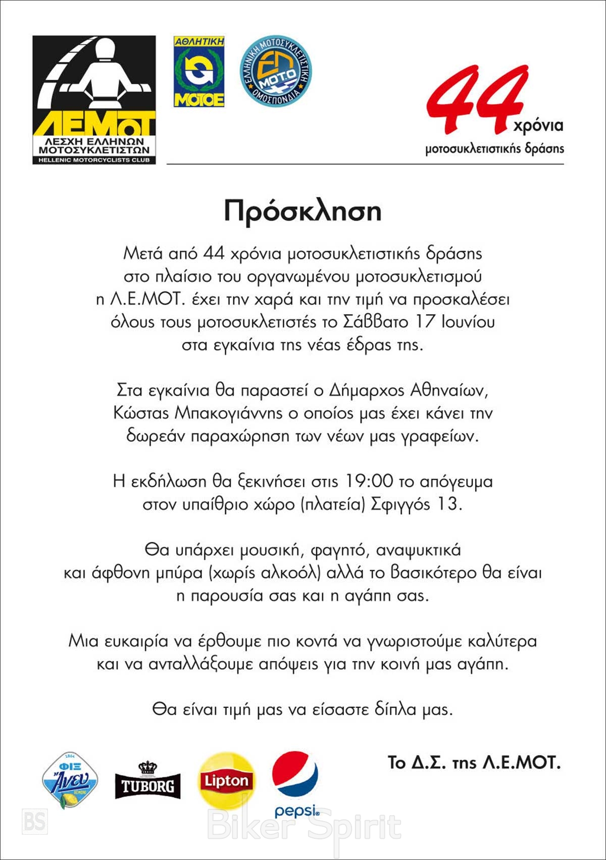 Μετά από 44 χρόνια μοτοσυκλετιστικής δράσης στο πλαίσιο του οργανωμένου μοτοσυκλετισμού η Λ.Ε.ΜΟΤ. έχει την χαρά και την τιμή να προσκαλέσει όλουs τουs μοτοσυκλετιστέs το Σάββατο 17 Ιουνίου στα εγκαίνια της νέας έδρας της.