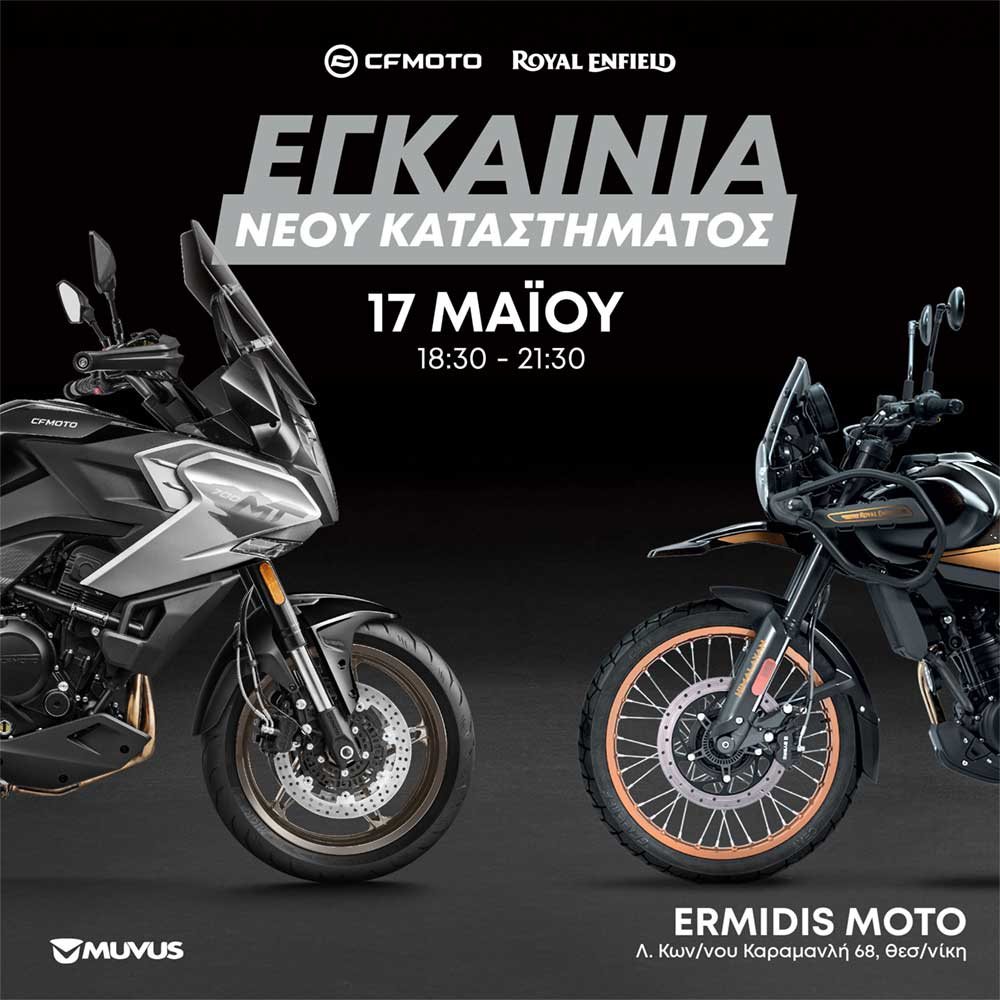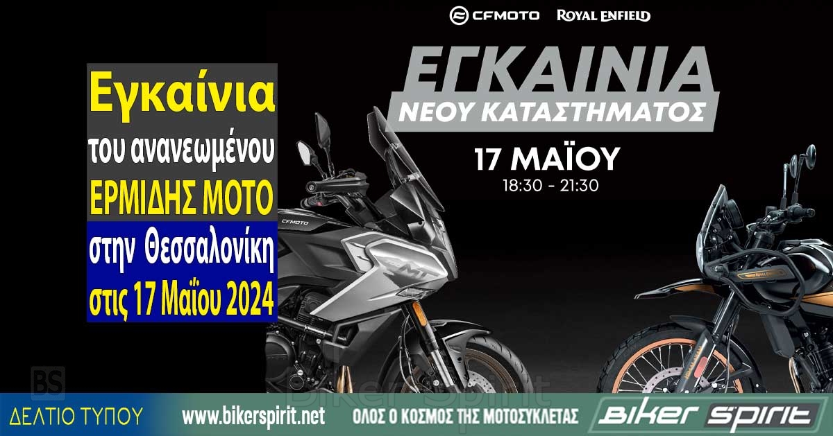 ΔΕΛΤΙΟ ΤΥΠΟΥ: Η ΕΡΜΙΔΗΣ ΜΟΤΟ προσκαλεί στα εγκαίνια του ανακαινισμένου κάθετου καταστήματος ΕΡΜΙΔΗΣ ΜΟΤΟ στην Θεσσαλονίκη την Παρασκευή 17 Μαΐου και ώρα 18:30, να γιορτάσουν μαζί τον νέο χώρο που φιλοξενεί τις μάρκες της CFMOTO και ROYAL ENFIELD.