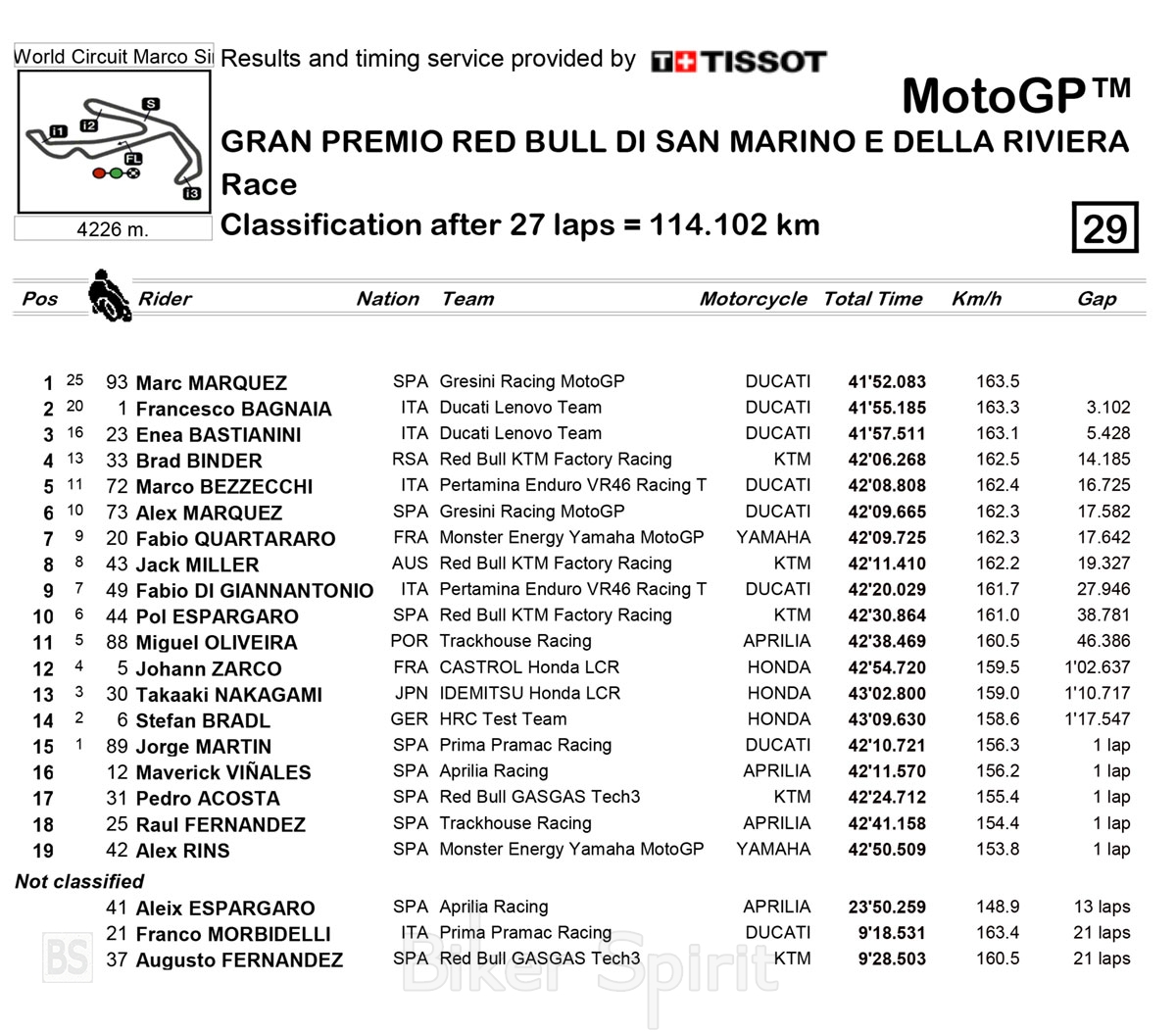 Αυτή είναι 2η συνεχόμενη νίκη του Marquez μετα το Aragon την προηγούμενη βδομάδας, η 2η νίκη του με την Ducati και η 2η νίκη της σεζόν, και η 61η στο MotoGP και η 87η στην καριέρα του. Βεβαία μεγαλώνει και το ρεκόρ του με τις περισσότερές νιές στην πίστα του Misano που φτιάνουν τις 5 στην μεγάλη κατηγόρια!