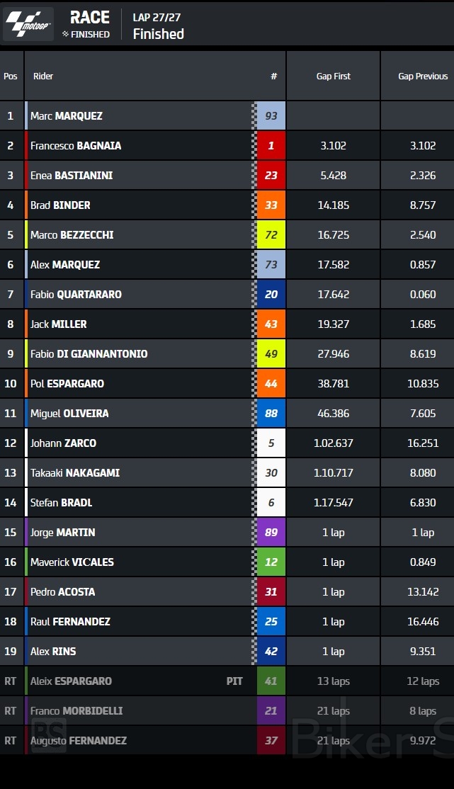 Στην παγκόσμια κατάταξη ο Martin παραμένει πρώτος με την διαφορά να πέφτει στους 7 βαθμούς από τον Bagnaia, ενώ στην 3η συνεχίζει ο Marc Marquez με 53 βαθμούς από την κορυφη!