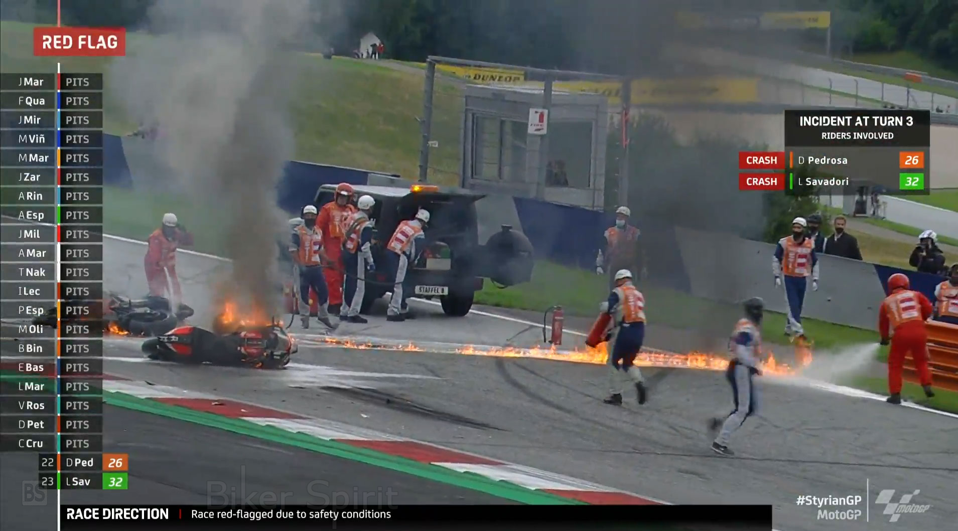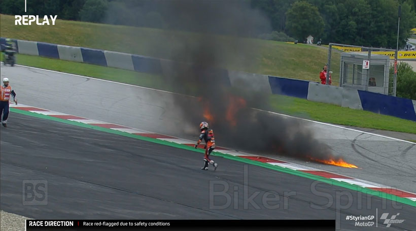 O αγώνας διακόπηκε προσωρινά λόγω της κόκκινης σημαίας λόγω του άσχημου ατυχήματος στον τρίτο γύρο στον οποίο ενεπλάκησαν οι Dani Pedrosa και Lorenzo Savadori. Ο αναβάτης της KTM έπεσε και ο Ιταλός δεν μπόρεσε να αποφύγει την πεσμένη μοτοσυκλέτα στην πίστα, και έτσι προκλήθηκε φωτιά μετά την σύγκρουση. Και οι δύο οδηγοί είναι εντάξει, αλλά μόνο ο Pedrosa εμφανίστηκε στην επανεκκίνηση, καθώς ο Savadori είχε ένα άσχημο χτύπημα στον δεξί αστράγαλο και στην Aprilia δεν ήθελαν να ρισκάρουν.